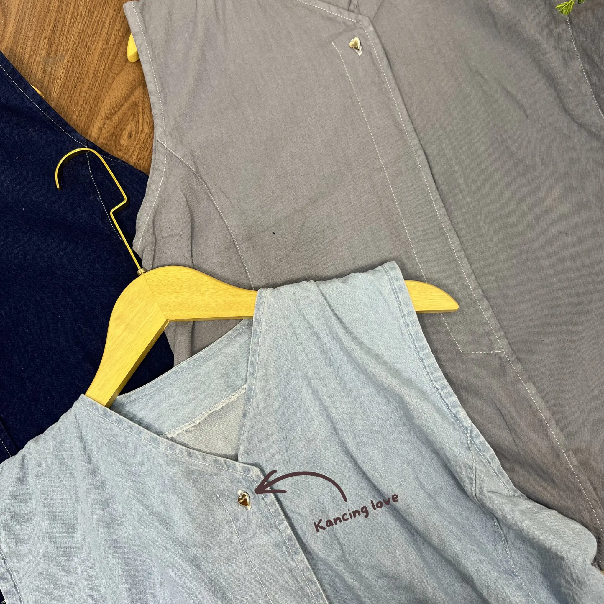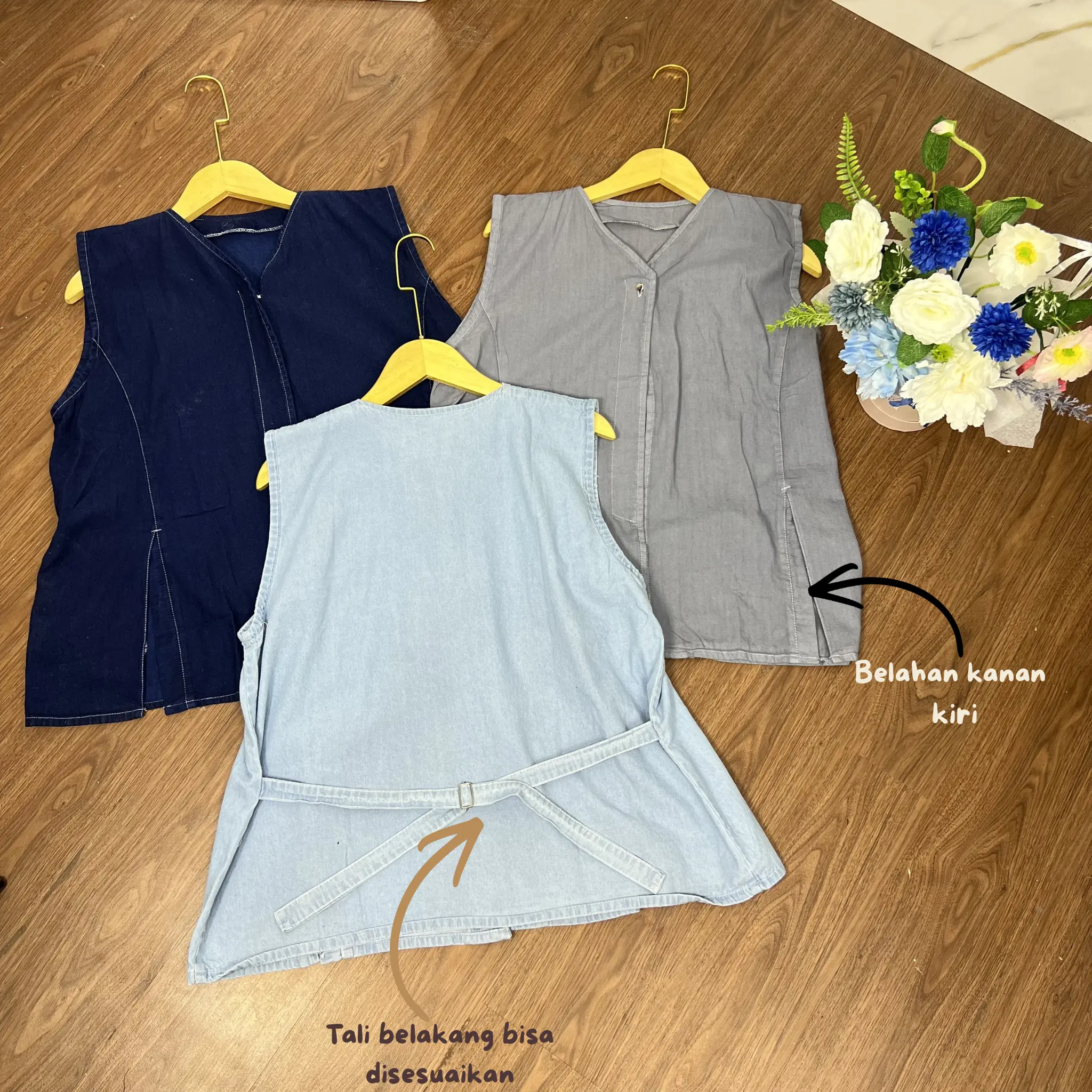 VIONA VEST - Outer rompi denim tanpa lengan - kancing love tengah - tali belakang dapat di sesuaikan