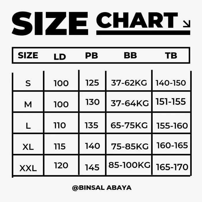 Diperkenalkan produk terbaru dari kami, 'Abaya embos basic star forzaleta'. abaya ini memiliki desain dasar yang menarik dengan embos Abaya ini terdiri dari bahan matt forzaleta yang diembos dengan gaya elegan dan cantik. Ready size mulai dari S hingga XXL dan memiliki ukuran sebagai berikut: - S: LD 100 cm, PB 125 cm - M: LD 100 cm, PB 130 cm - L: LD 110 cm, PB 135cm - XL: LD115cm,PB140cm - XXL :LD120,PB145 •ukuran bisa berbeda 1-3 cm karna proses priduksi Perkenalkan produk terbaru kami, yaitu 'Basic Abaya embos forzaleta exclusive SALE'. Abaya ini memiliki tekstur matt yang nyaman dipakai dan terbuat dari bahan forzaleta embos yang lembut dan adem. Desain abaya ini sangat cocok untuk ibu menyusui karena memiliki resleting di depan. Selain itu, tersedia juga saku di sebelah kanan untuk memudahkan Anda dalam menyimpan barang-barang kecil. Abaya ini memiliki potongan longgar dan lebar bawah mencapai 2.8 meter sehingga sangat nyaman dipakai dalam aktivitas sehari-hari. Dengan detail ukuran sebagai berikut: size S dengan lingkar dada 95 cm dan panjang 125 cm, size M dengan lingkar dada 100 cm dan panjang 130 cm, size L dengan lingkar dada 110 cm dan panjang 135cm ,size XL dengan lingkar dada 115 cm dan panjang 140 size XXL dengan lingkar dada sebesar 120cm dan panjang140cm. Dapatkan penawaran kami saat ini! Jan4gan ragu untuk menambahkan 'Basic Abaya embos forzaleta exclusive SALE' ke koleksi abayamu karena produk ini untuk kenyamanan bagi Anda yang ingin tampil santun namun tetap stylish di setiap kesempatan! 9