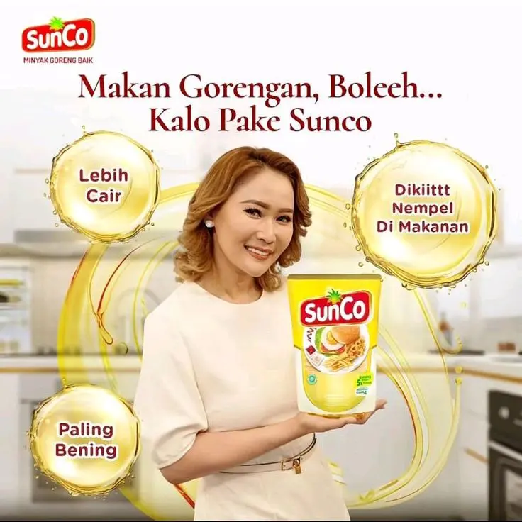 Minyak goreng SunCo kemasan 2 liter adalah minyak goreng nabati premium yang terbuat dari 100% kelapa sawit segar, diproses melalui 5 tahapan (3x pemurnian, 2x penyaringan) untuk menghasilkan minyak bening, tidak mudah beku, dan tidak lekat. Difortifikasi vitamin A dan E, SunCo dikenal sehat, rendah lemak jenuh, dan tidak cepat hitam.