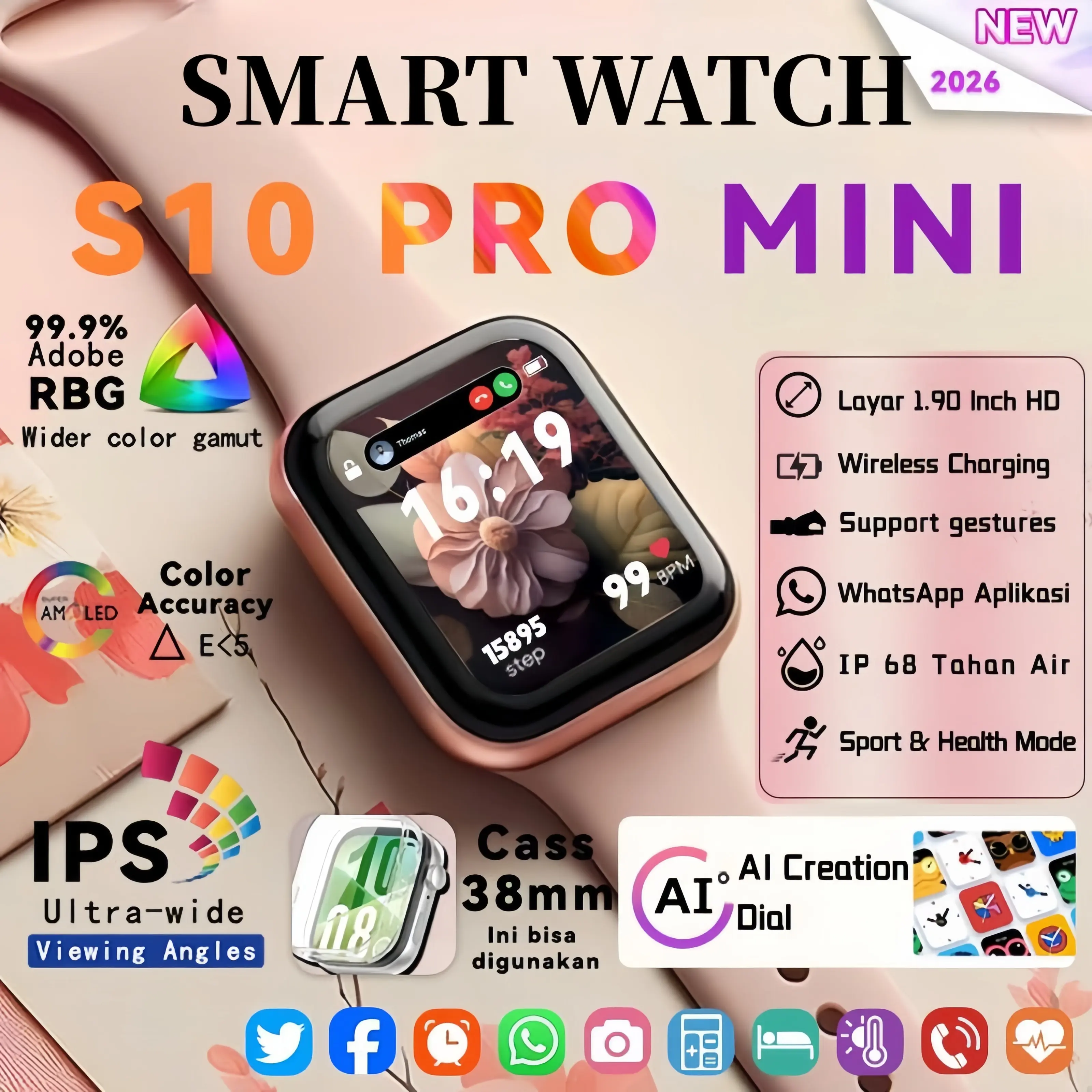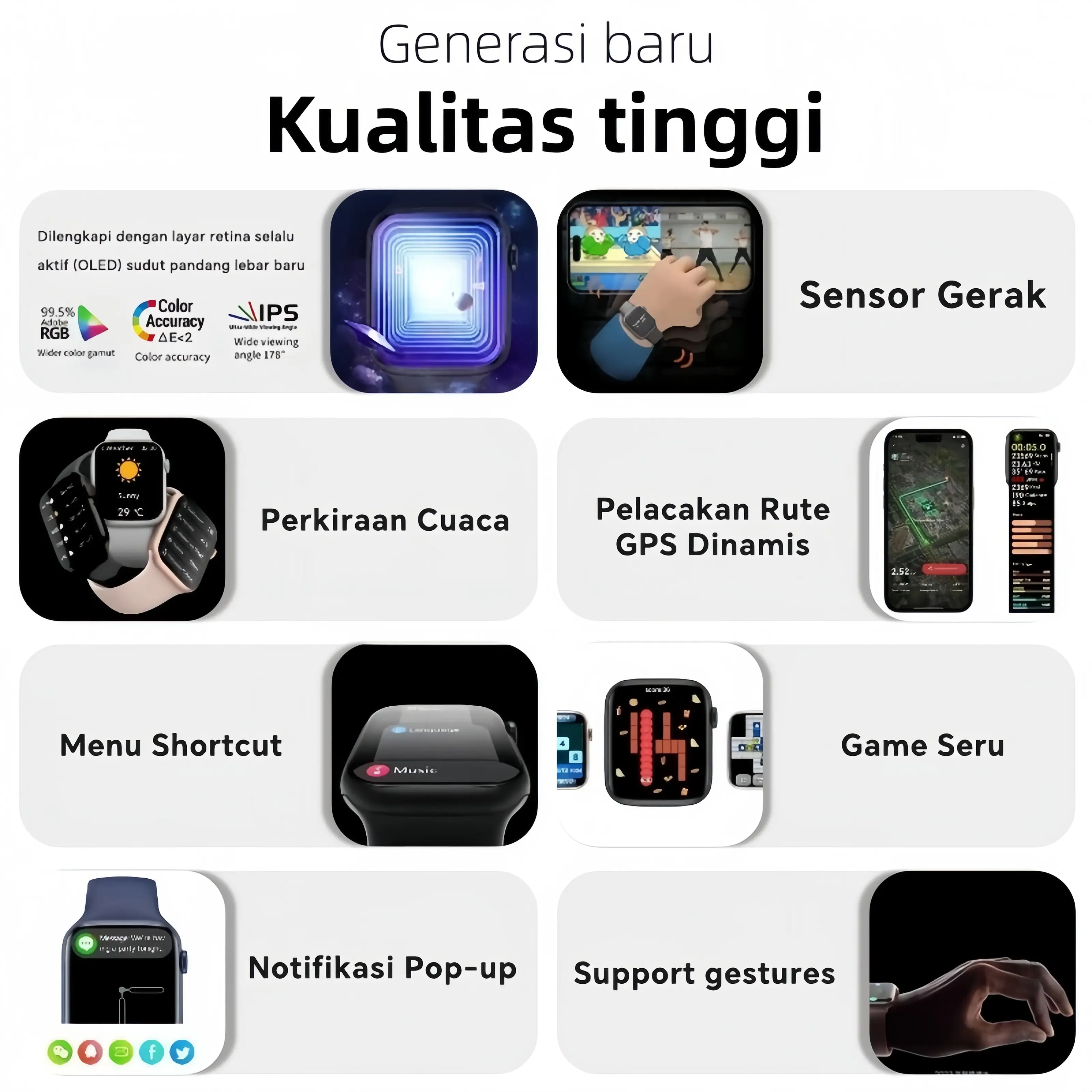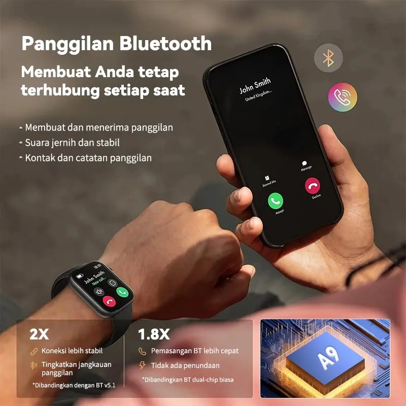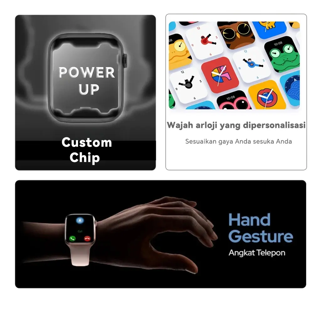 Fitur unik: Baterai Bertahan Hingga 5-7 HARI (HRS3300) Monitor Denyut Jantung, Darah, dan Oksigen 24/7 Tahan Debu, Retak, dan Air dengan Sertifikat IP68 Kompatibel dengan Semua Perangkat Bluetooth (HS6621) Chip Tercanggih se-Indonesia untuk Smartwatch Resolusi HD (468*568) Mendukung Pengisian Magnetik / Magnetic Charging Layar IPS Warna WaterColor Terima Panggilan & Putar Musik di Smartwatch Tersedia 20 Bahasa Indonesia,Inggris, Cina, Jepang, Rusia, Portugis, Perancis, Spanyol, Korea, Jerman, Italia, Arab, Ukraina. Watch Face dan Strap Mudah dimodifikasi Tersedia dalam 5 Warna Unik Bisa buka notifikasi HP dari Smartwatch Garansi gratis 12 bulan