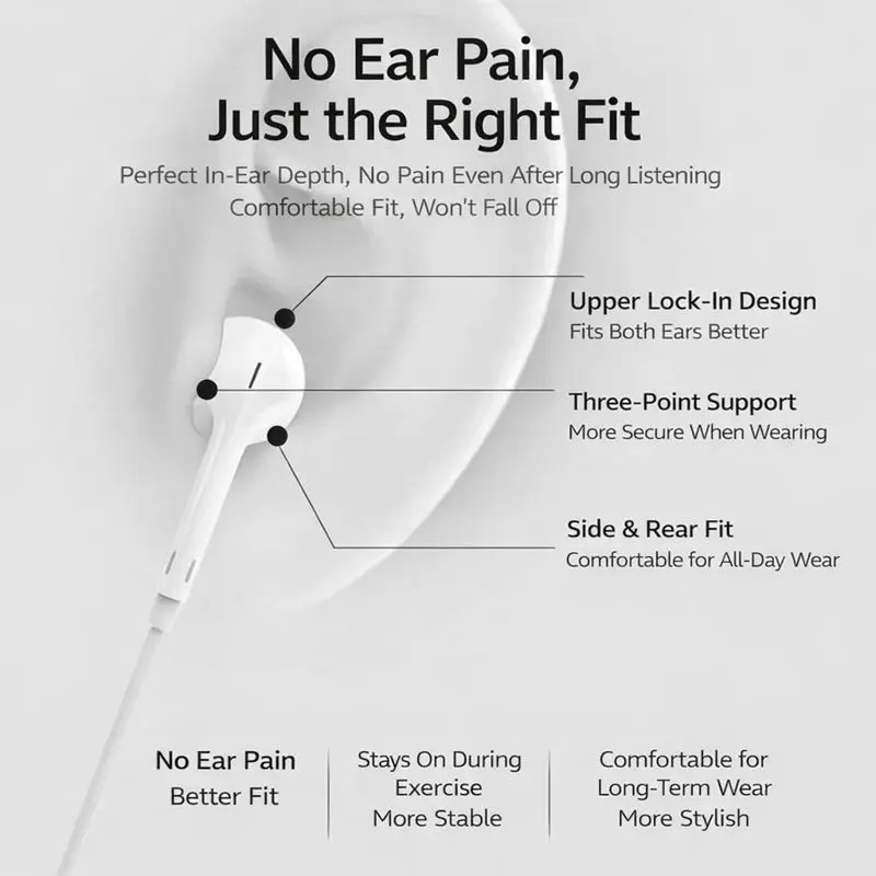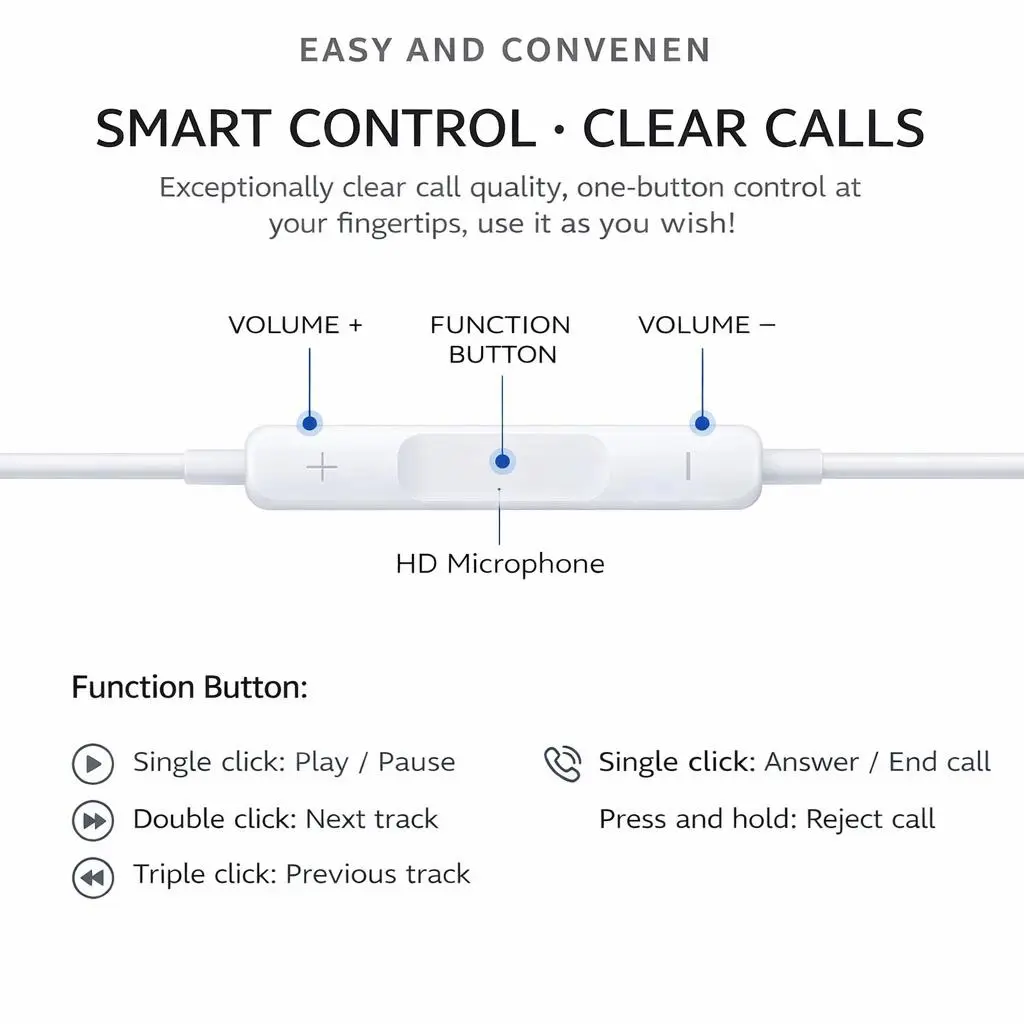Desain ergonomis membuat headset nyaman dipakai dalam waktu lama. Dilengkapi mikrofon dan tombol kontrol pada kabel untuk memudahkan mengatur volume, musik, serta menjawab panggilan tanpa perlu membuka ponsel.