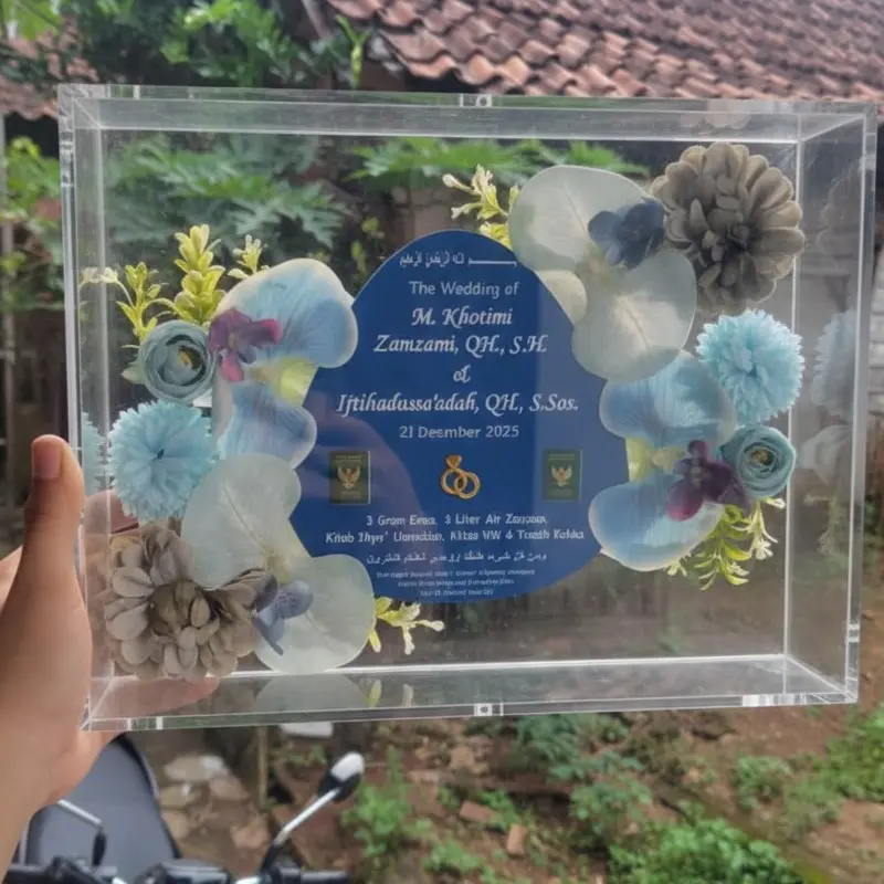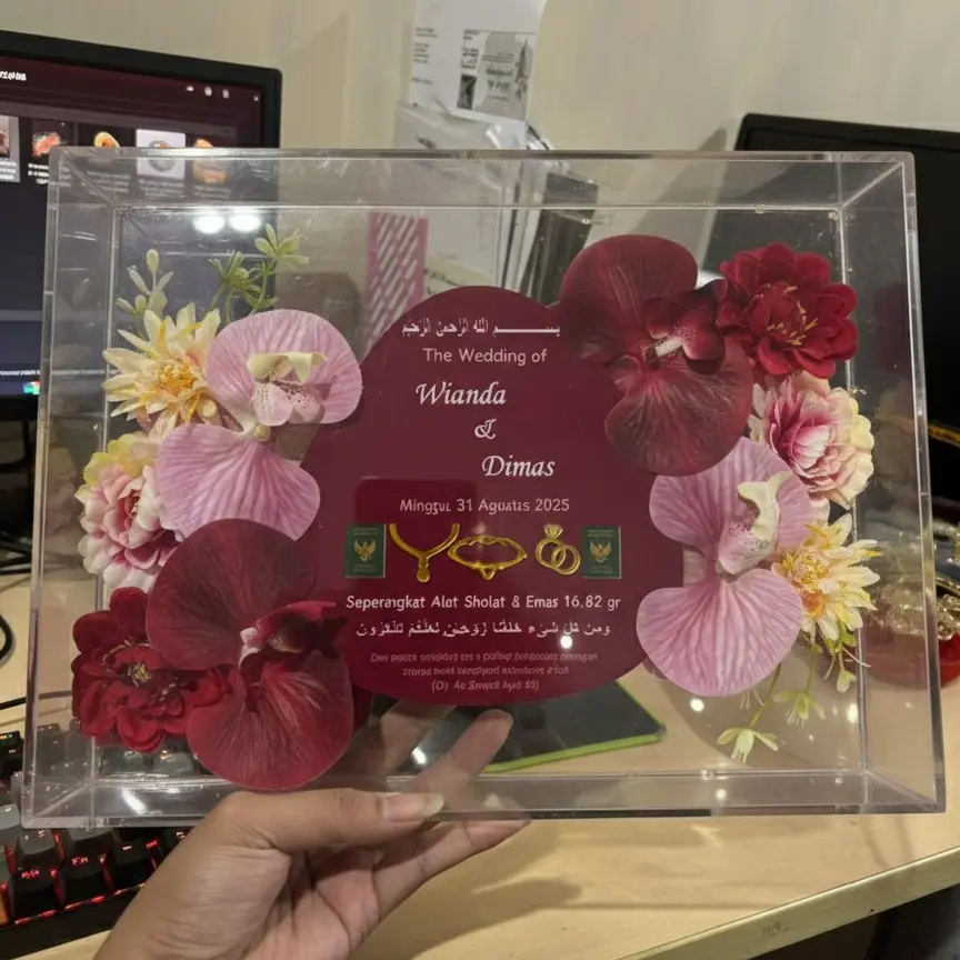 Keuntungan dari menggunakan mahar akrilik adalah tahan lama dan tidak mudah pecah. Selain itu, mahar ini juga dapat menampilkan mahar dengan jelas dan detail karena terbuat dari bahan akrilik yang berkualitas. Dengan menggunakan mahar ini, Anda tidak perlu khawatir mahar akan rusak atau pecah saat digunakan.
