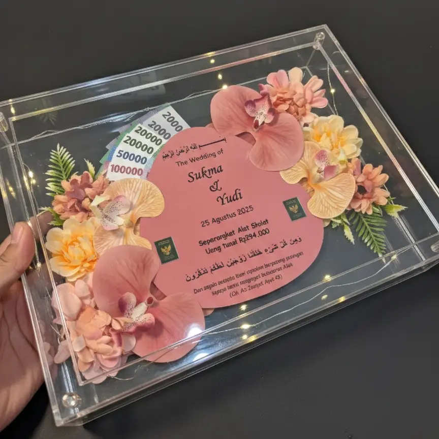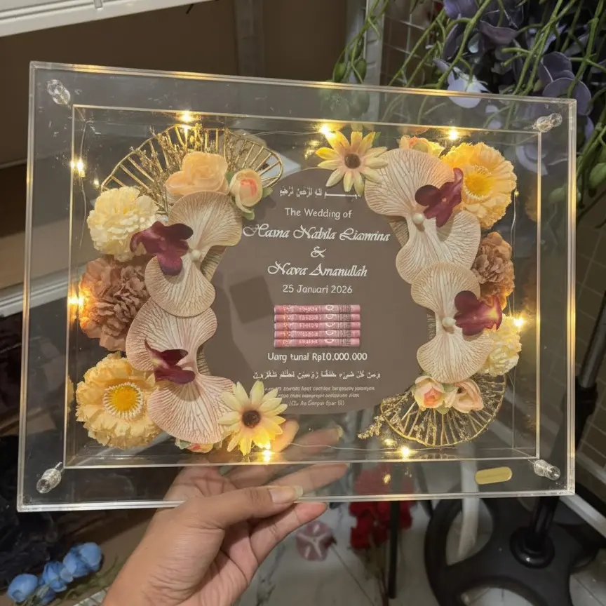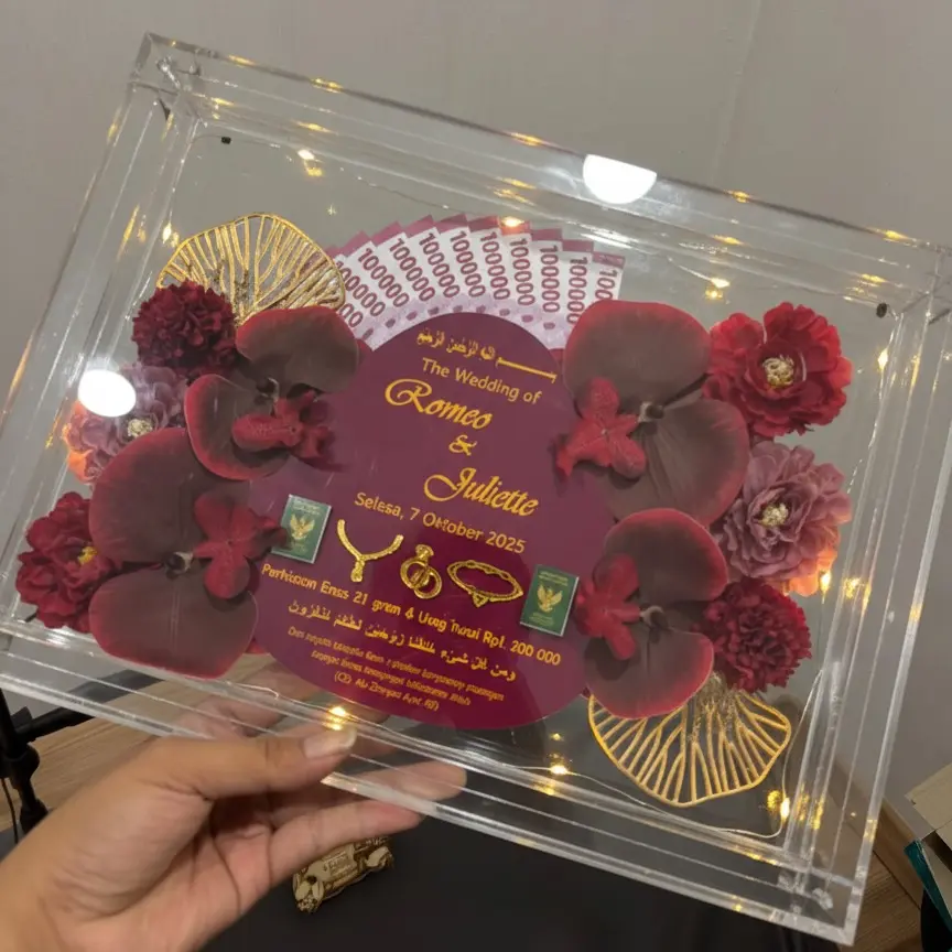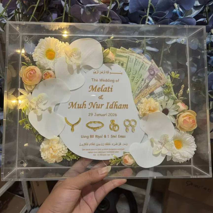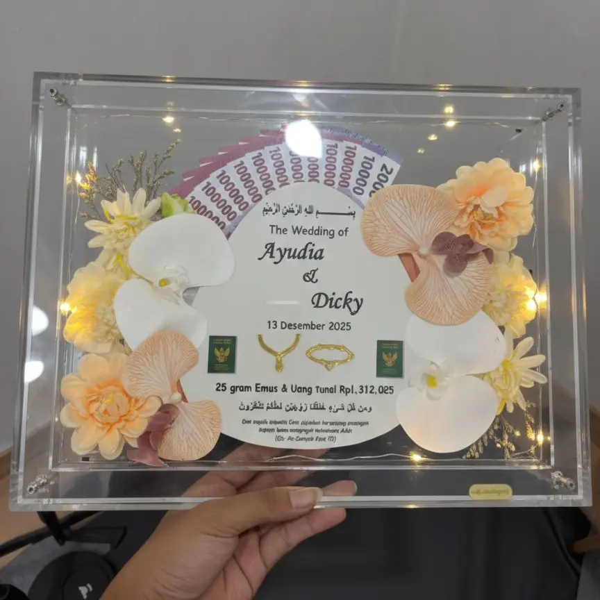 Mahar Pernikahan 25x35 adalah produk yang dijual dengan desain yang estetik dan viral. Produk ini terbuat dari bahan akrilik yang tahan lama dan tidak mudah pecah. Mahar ini memiliki ukuran 25x35 yang besar sehingga dapat menampilkan mahar dengan jelas dan detail.