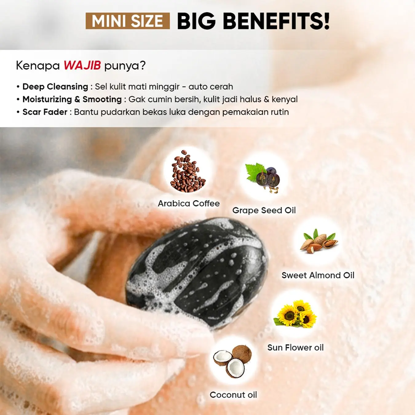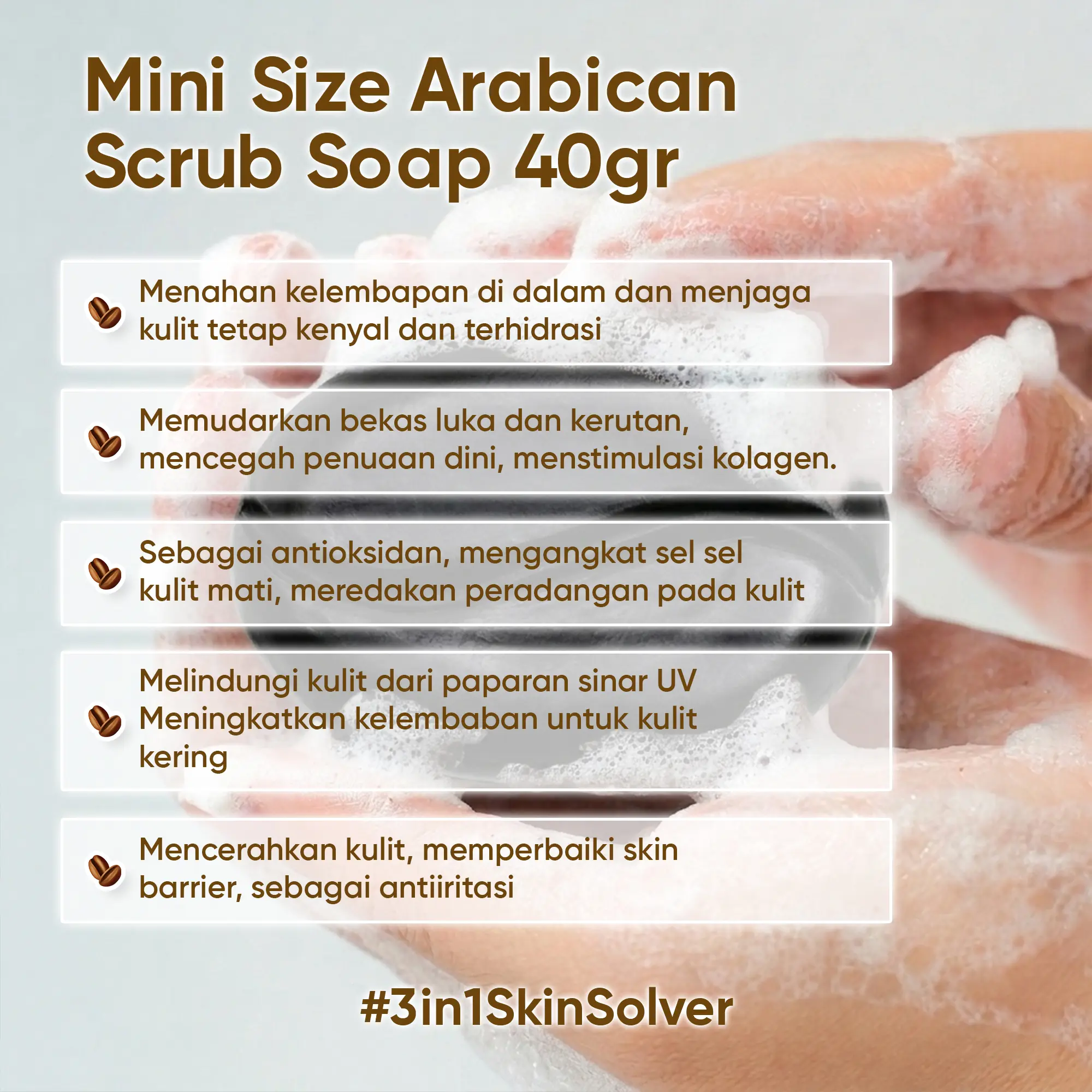 Sabun non SLS dengan biji kopi Arabica, Ceramide, Hyaluronic Acid, dan Centella Asiatica, yang membantu memperbaiki skin barrier, menyamarkan bekas jerawat, serta mengurangi peradangan, bekas luka serta stretch mark. Dilengkapi dengan Tea Tree Oil, Sunflower Oil, dan Grape Seed Oil, sabun ini juga melembapkan dan menenangkan kulit, aman digunakan di seluruh tubuh.