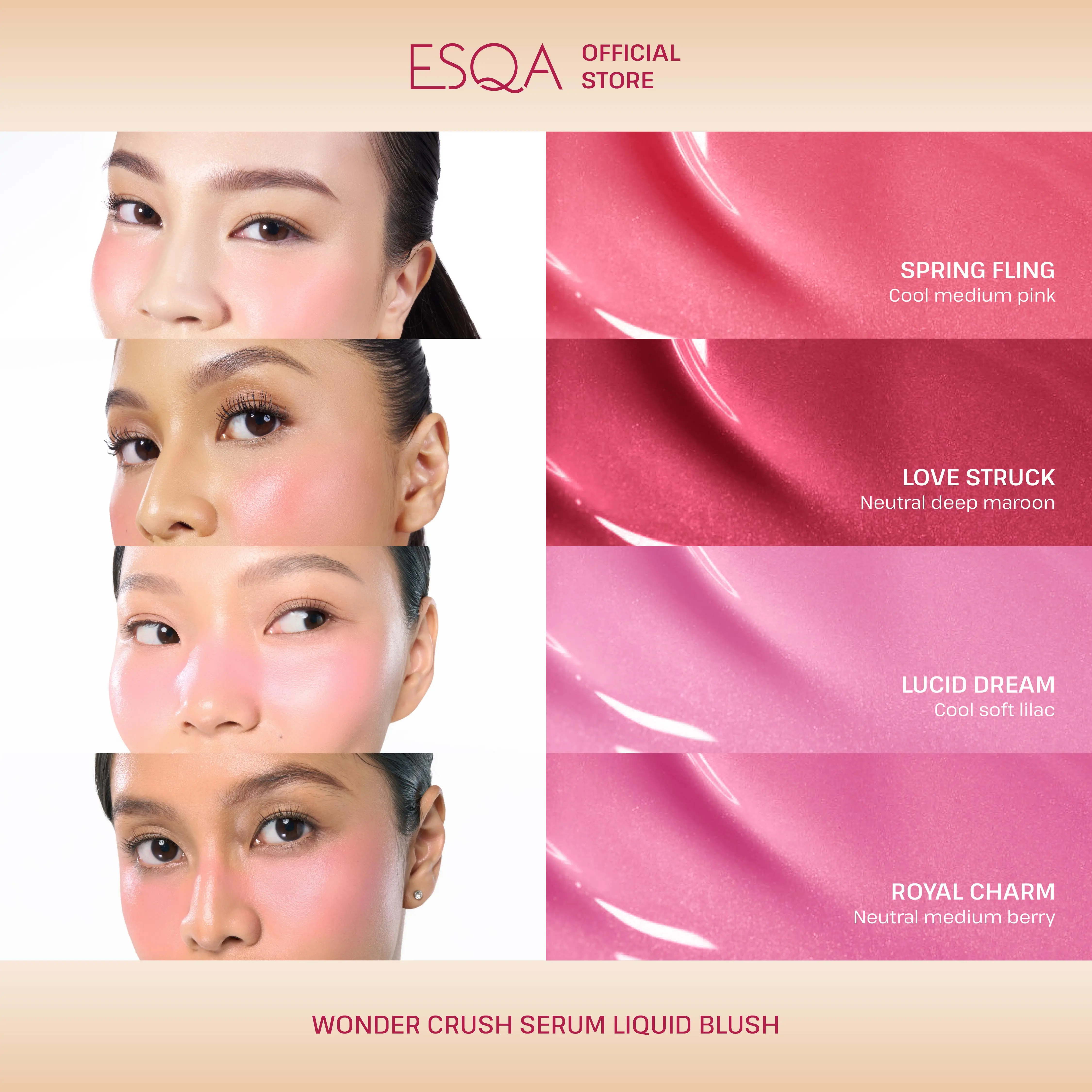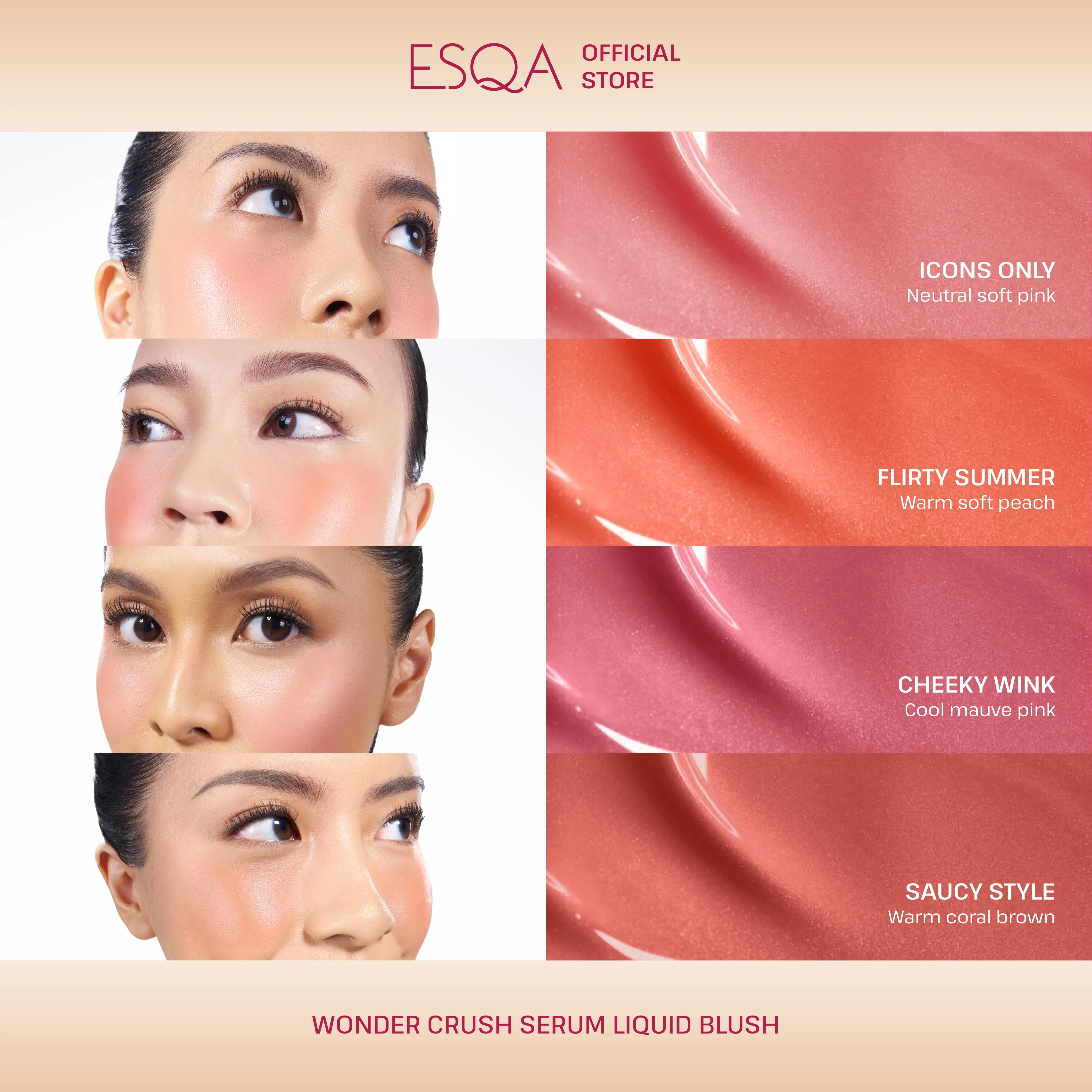 Blushing when youre Crushing! Its time to express yourself through colorful rush of ESQA Wonder Crush Serum Liquid Blush! This creamy blush is made in lightweight texture that melts into your skin seamlessly, resulting in natural flush that last throughout the day.