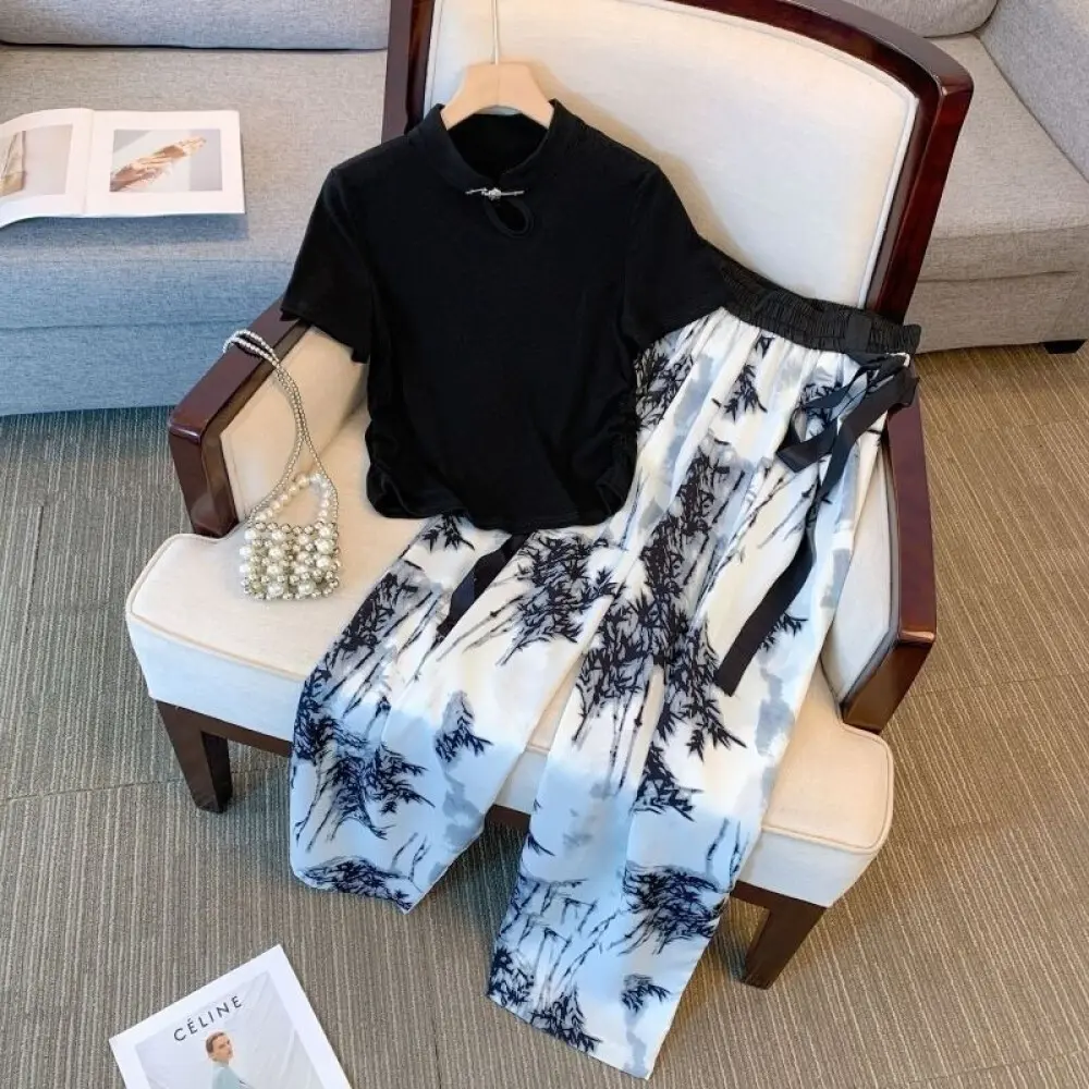 FADFAD Setelan Dua Potong Pakaian Wanita Lengan Pendek Bergaya Cina
