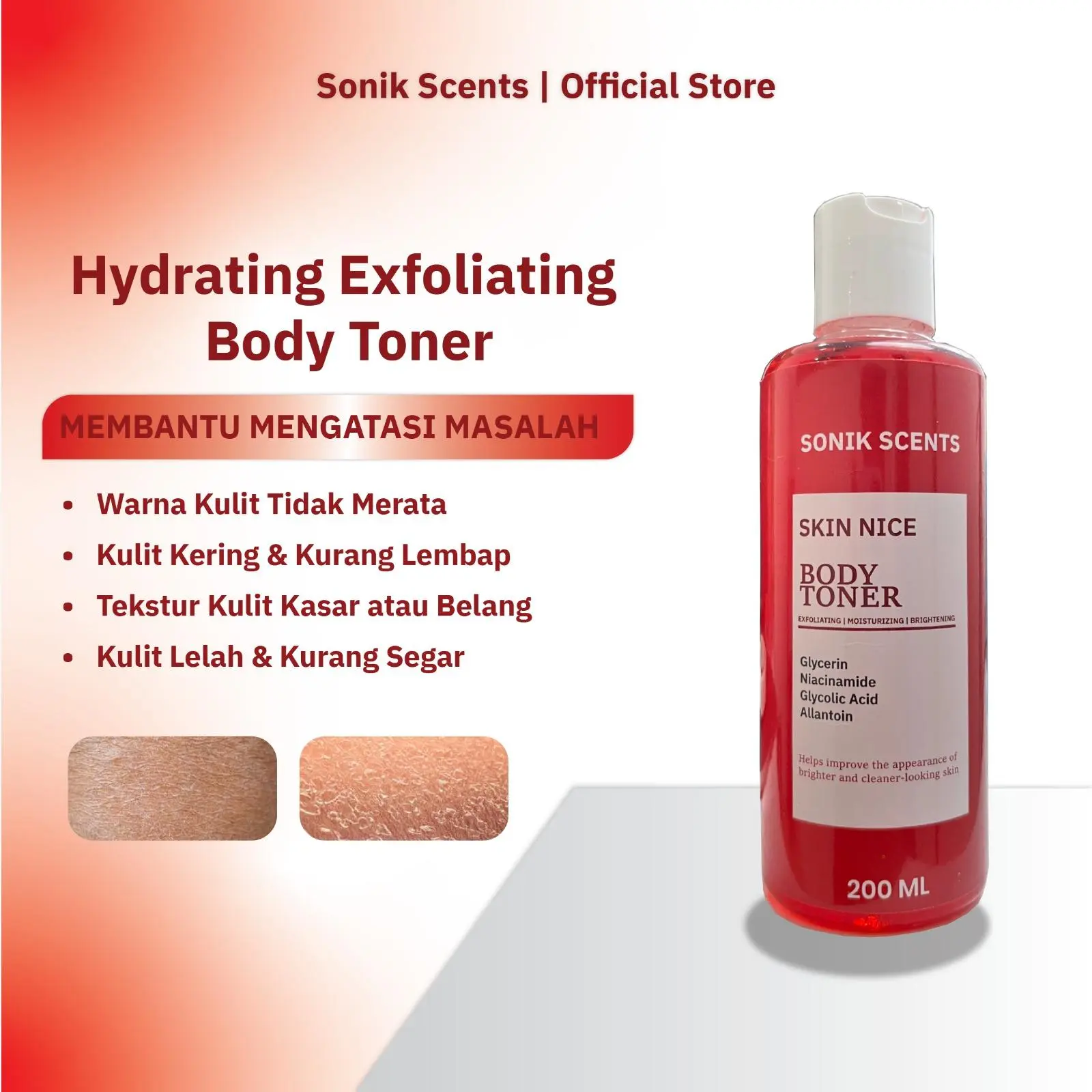 Sonik Scents Skin Nice Body Toner adalah toner tubuh yang diformulasikan untuk mengangkat sel kulit mati, melembapkan, dan membantu mencerahkan warna kulit secara bertahap. Dengan kombinasi exfoliant lembut dan hidrasi mendalam, toner ini membantu menjadikan kulit tubuh, cerah, terawatt dan terlihat bercahaya.
