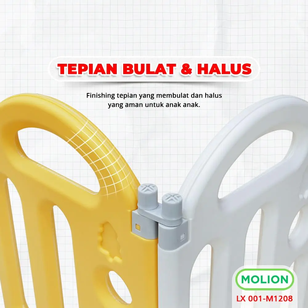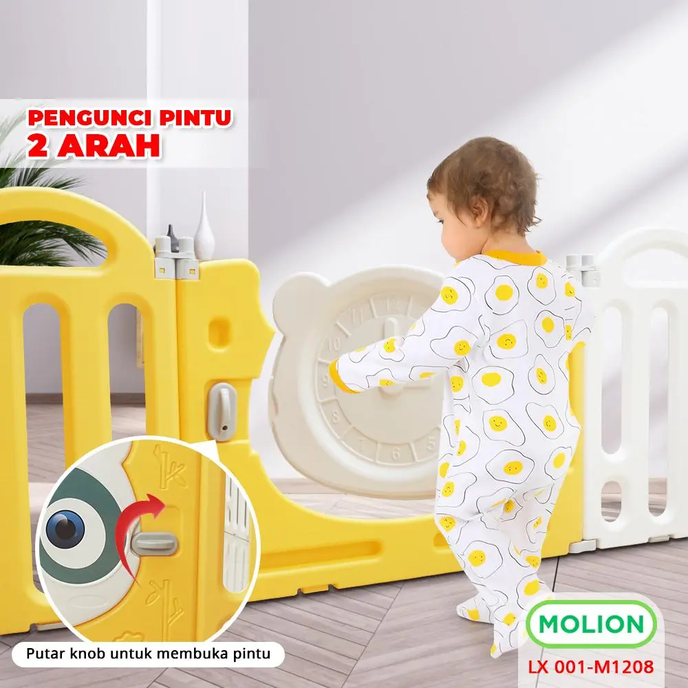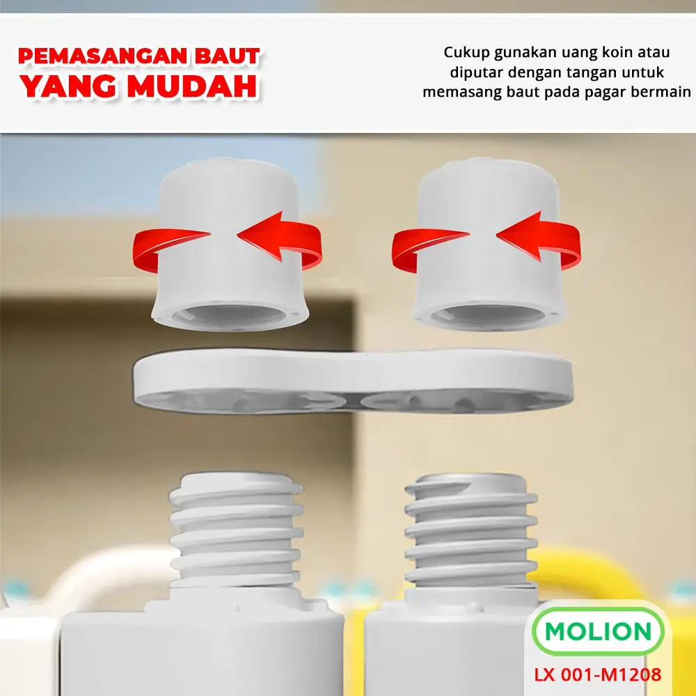 Playfence ini dapat membuat Anda jauh lebih tenang, mengetahui anak anda berada di dalam lokasi yang Aman. Memiliki model lengkungan tumpul halus yang nyaman digenggam dan aman bagi anak. Pada bagian pintu, terdapat kunci yang dapat diputar untuk membuka dan menutup pagar.