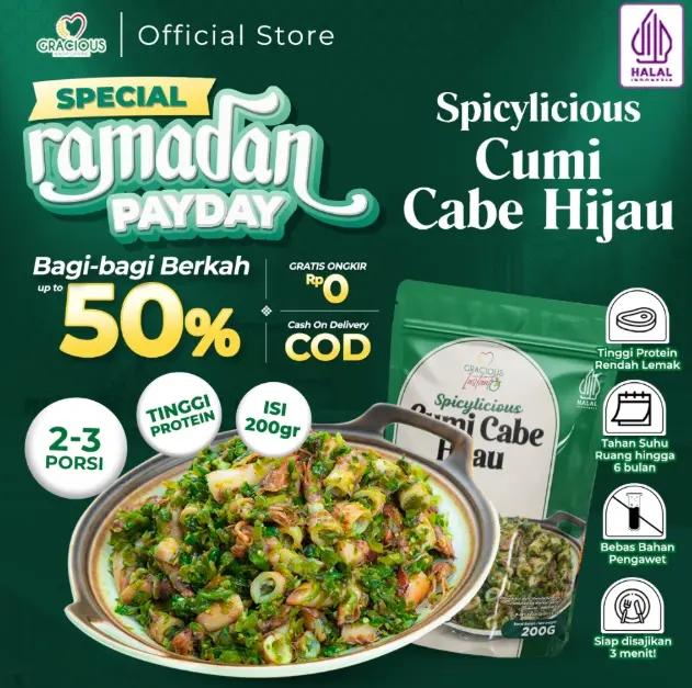 5. GRATIS ONGKIR Gracious Spicylicious Cumi Cabe Hijau (Makanan Instant Sehat Siap Saji)