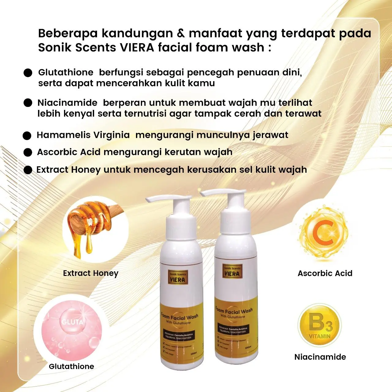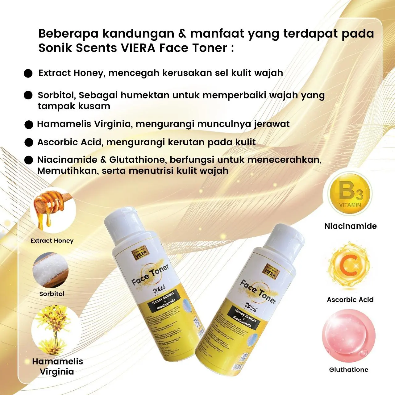 4 VIERA Face Toner with Honey Extract,Niacinamide & Gluthation :.Honey, Sorbitol. Hamamelis Virginia, Ascorbic acid Niacinamide & Gluthation