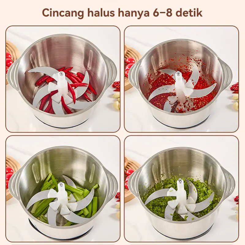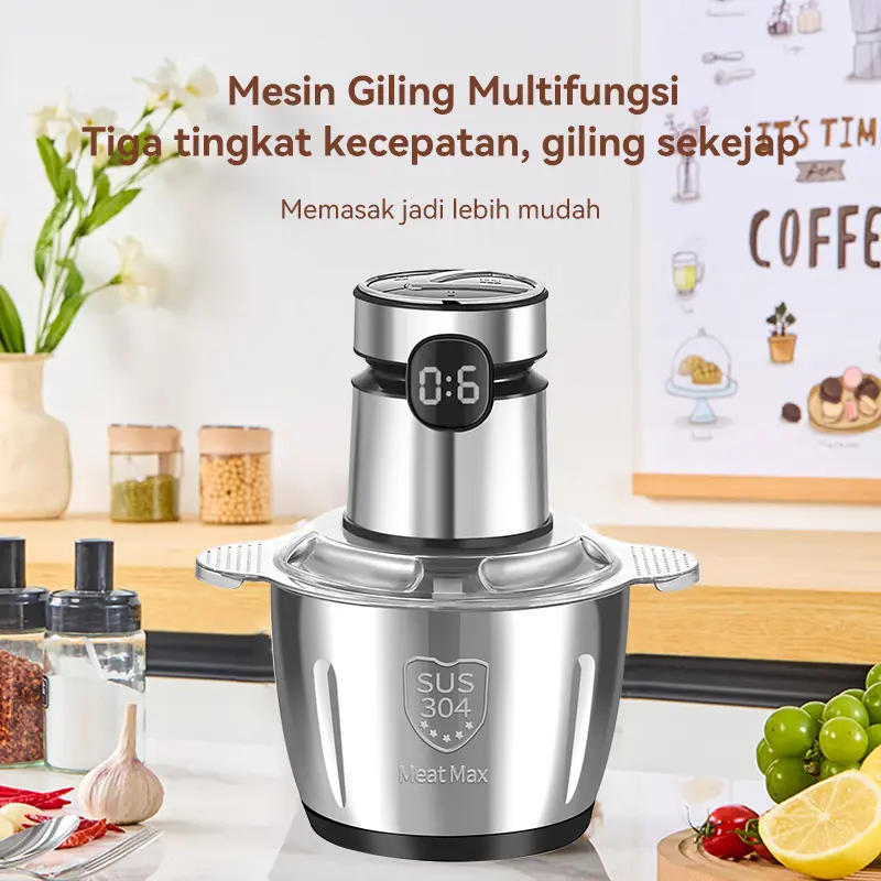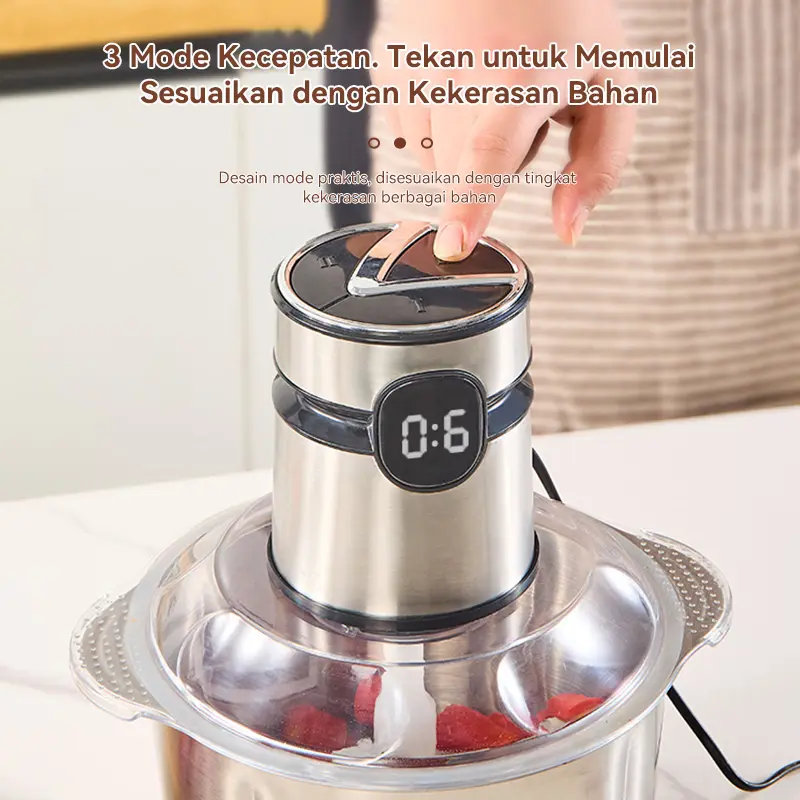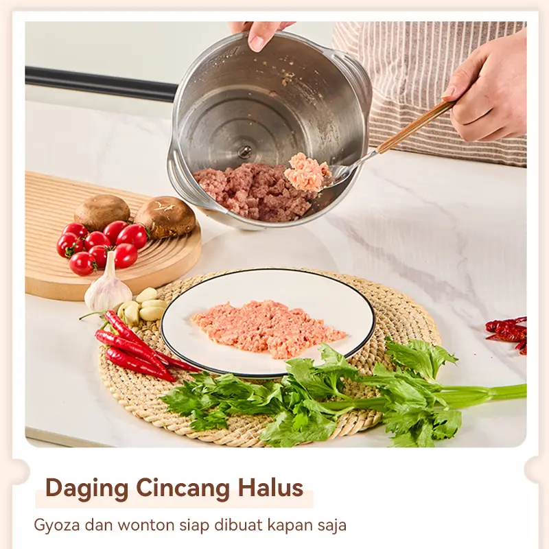Penggiling/blender daging rumah tangga untuk daging, sayuran, dan buah-buahan, kapasitas 2 liter.