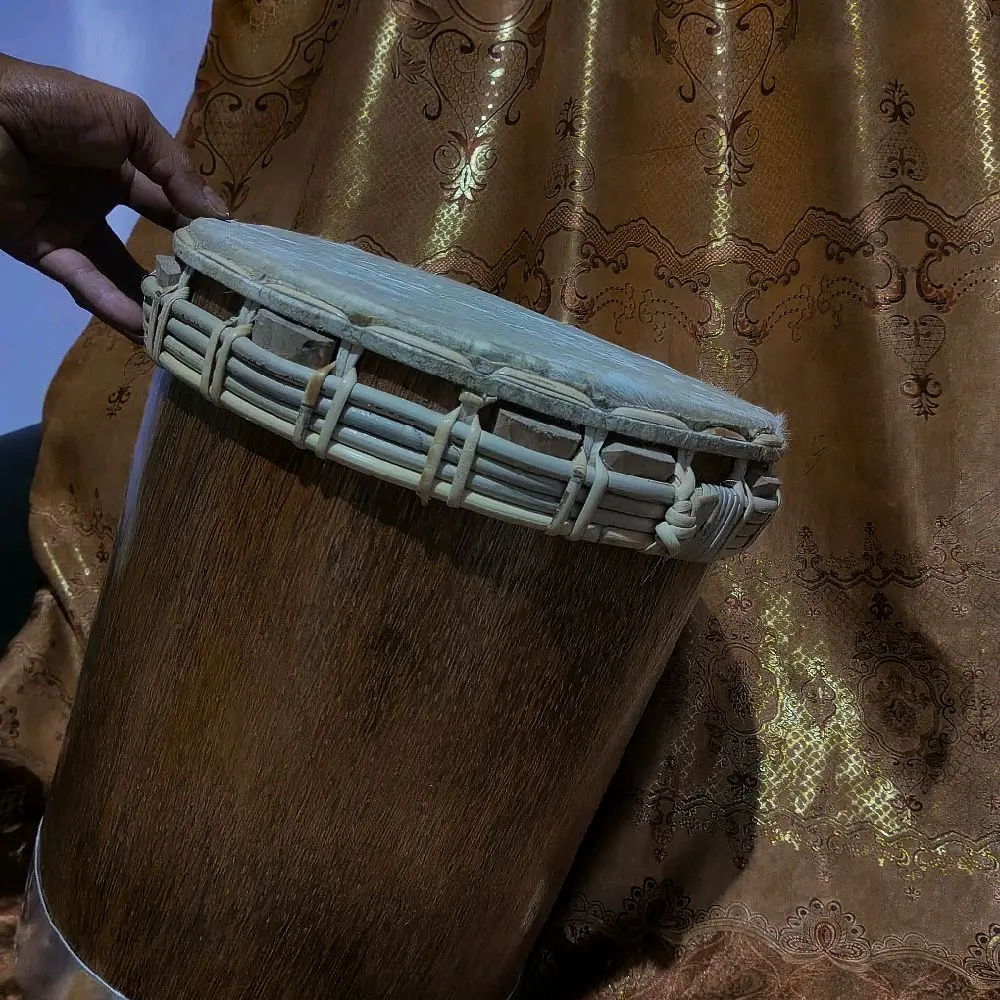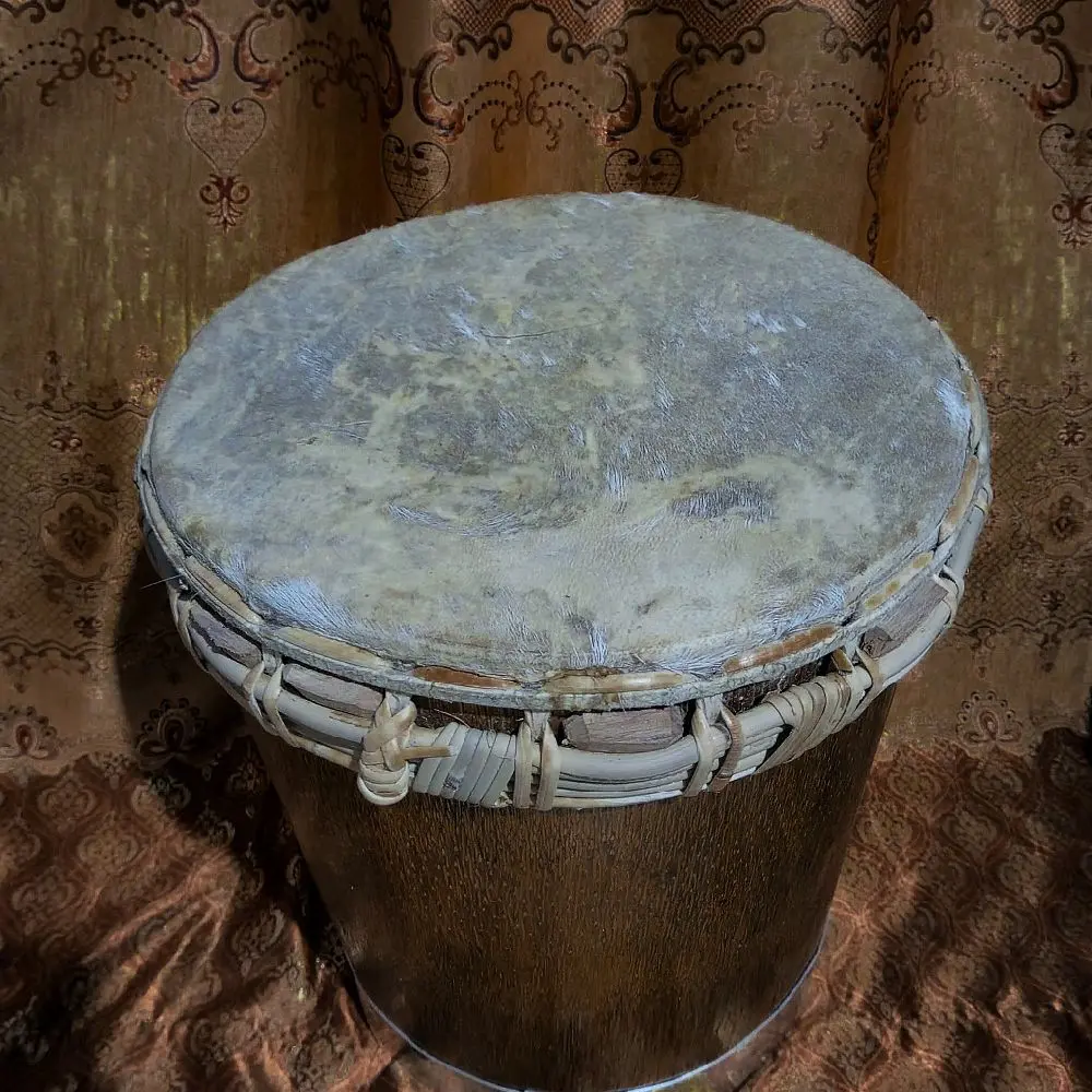 - Bahan utama: Kayu kelapa + Kulit kambing (membran)