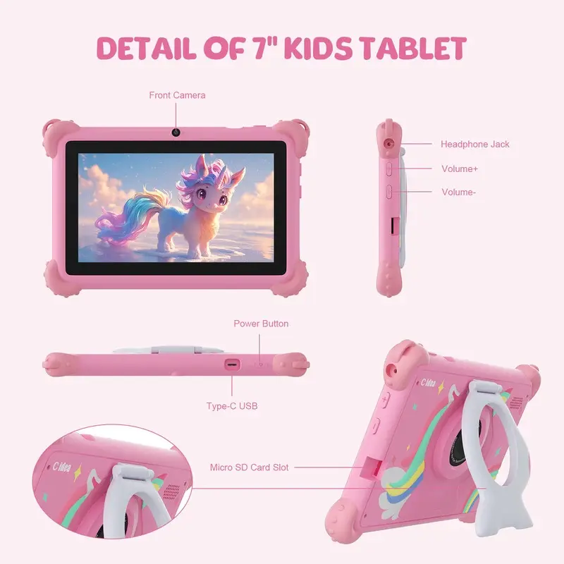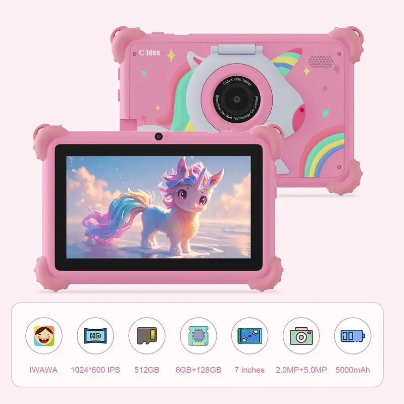 Tablet Anak C Idea 7 Inch hadir dengan desain lucu motif unicorn dan warna pastel yang menarik, cocok untuk menemani aktivitas belajar dan bermain si kecil. Dilengkapi case anti shock dengan sudut pelindung tebal, tablet ini lebih aman dari benturan dan nyaman digenggam anak-anak.