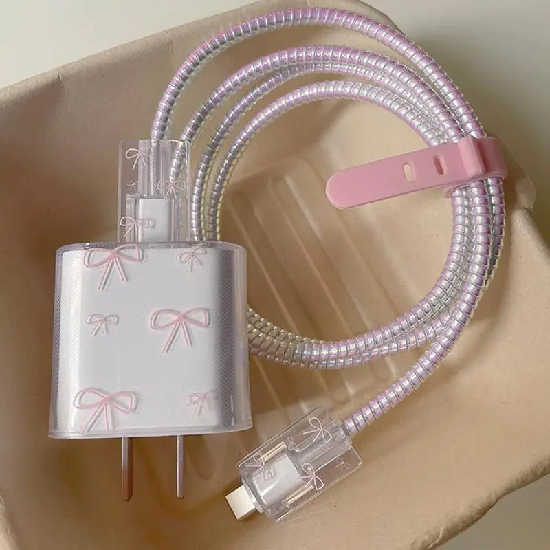 【COD】[Model Terbaru]Pita Pink Charger Protective Case Transparan Anti Folding Protective Case Cocok untuk IP