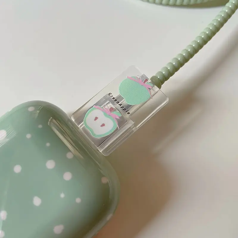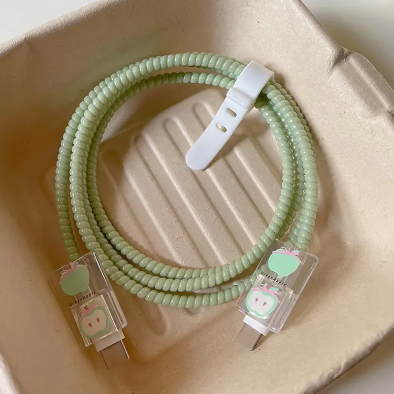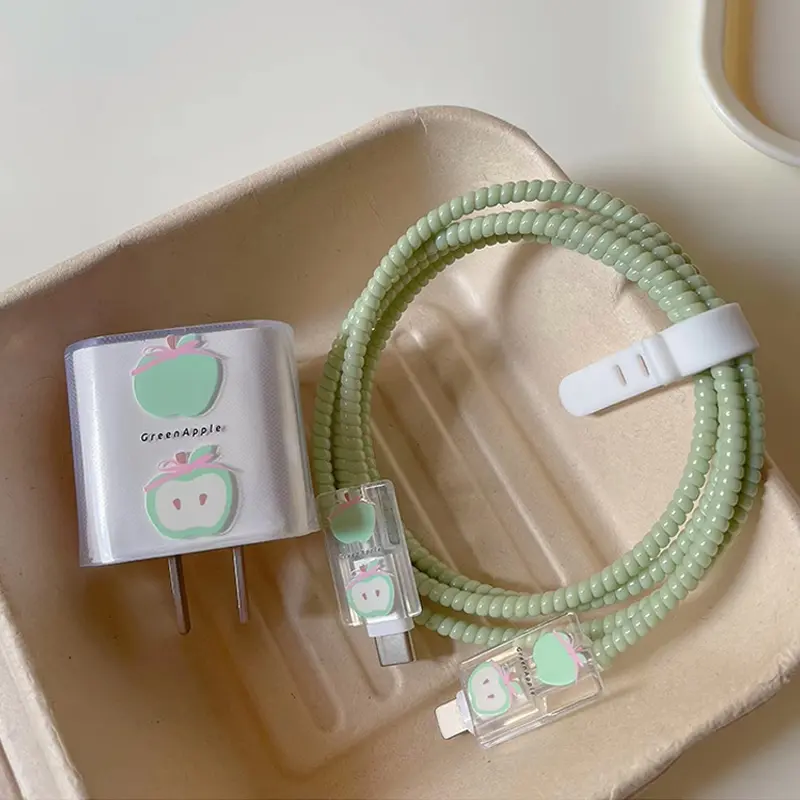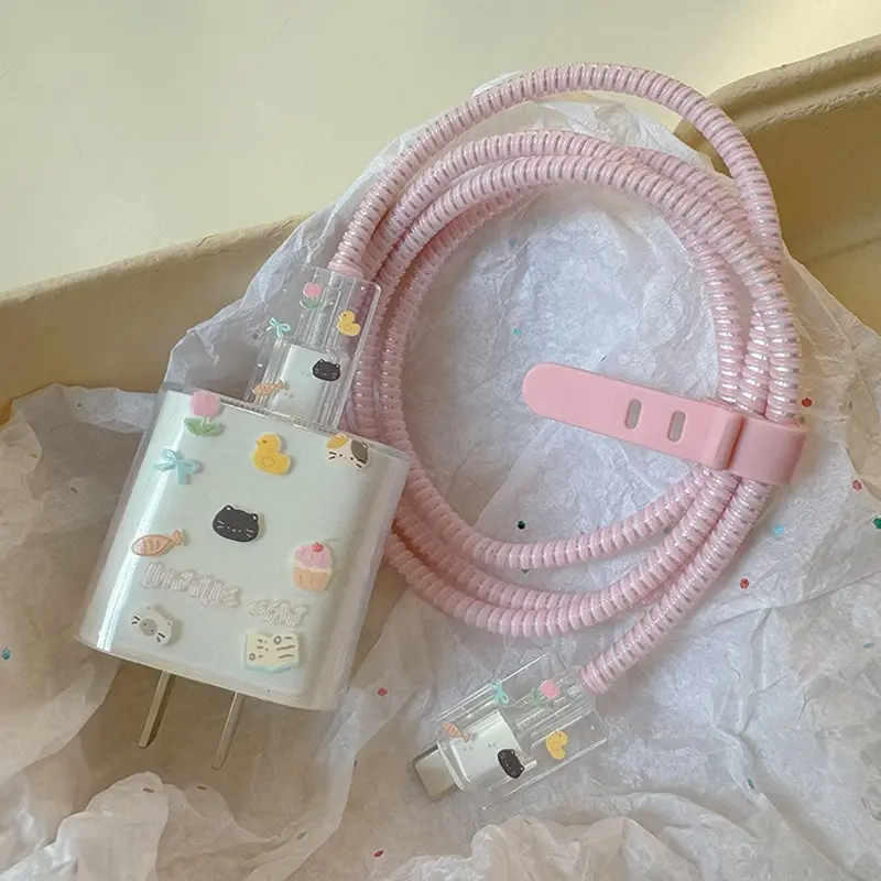 Desain: Set ini dibagi menjadi lima bagian. Salah satunya adalah kasus pelindung dari colokan pengisian daya, dihiasi dengan aksesoris yang lucu dan indah di atasnya; Yang kedua adalah struktur spiral kawat perlindungan jalur pengisian, yang dibungkus di sekitar pinggiran kawat asli untuk melindunginya dari pecah. Bahkan jika pecah, bahan isolasi struktur spiral masih dapat melindungi Anda dari kejutan listrik; Bagian ketiga dan keempat digunakan untuk melindungi kedua ujung kabel pengisian, dan juga dihiasi dengan pola lucu untuk mencegah kabel pengisian pecah karena lenturan jangka panjang; Bagian kelima adalah menyimpan ikatan zip, yang dapat mencegah kabel data menjadi berantakan.