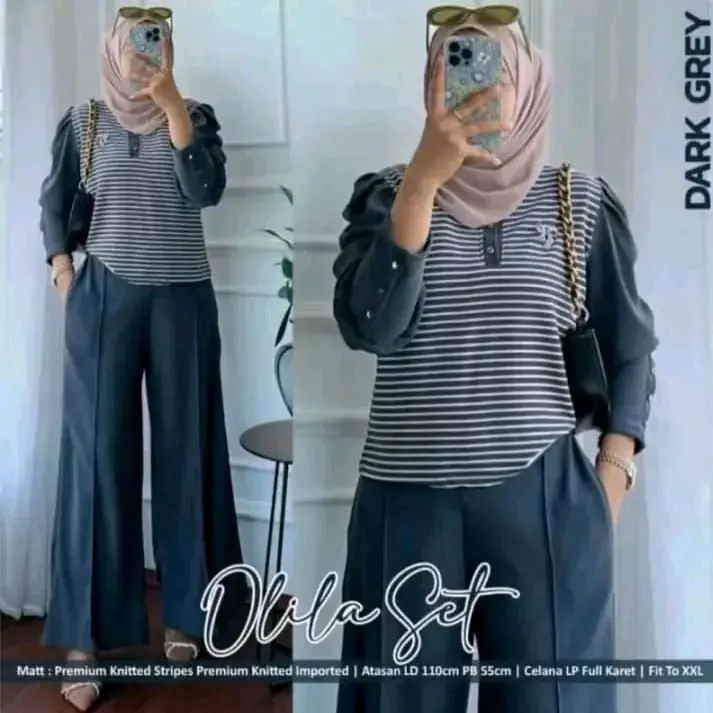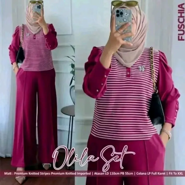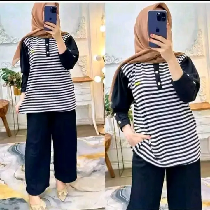 Olila Set Setelan Wanita Kekinian One Set Motif Salur Garis Katun Lembut Nyaman Remaja Dewasa Cantik