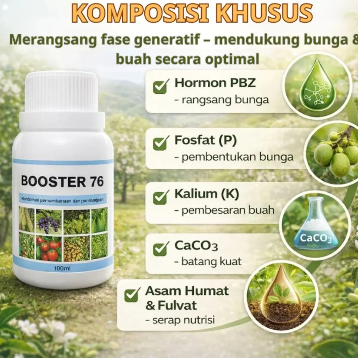 Pupuk Sintesis Booster 76 memiliki kandungan nutrisi yang seimbang dan lengkap, termasuk unsur hara makro dan mikro yang penting bagi tanaman. Nutrisi ini membantu tanaman dalam mengoptimalkan proses fotosintesis, pertumbuhan akar, pembentukan bunga, dan perkembangan buah. Dengan demikian, pupuk ini berkontribusi dalam meningkatkan hasil panen serta kualitas tanaman yang lebih baik.