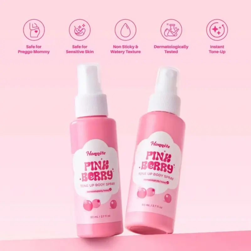 HONNETE Pink Berry Tone Up Body Spray adalah produk bodycare yang diformulasikan khusus untuk memberikan efek tone up instant pada kulit.