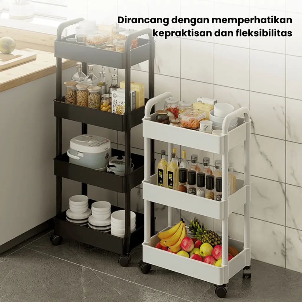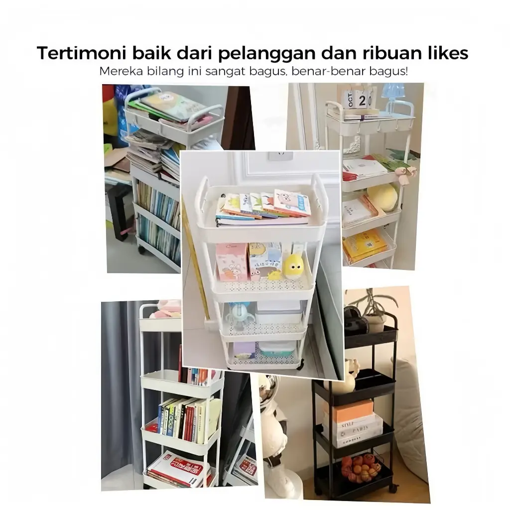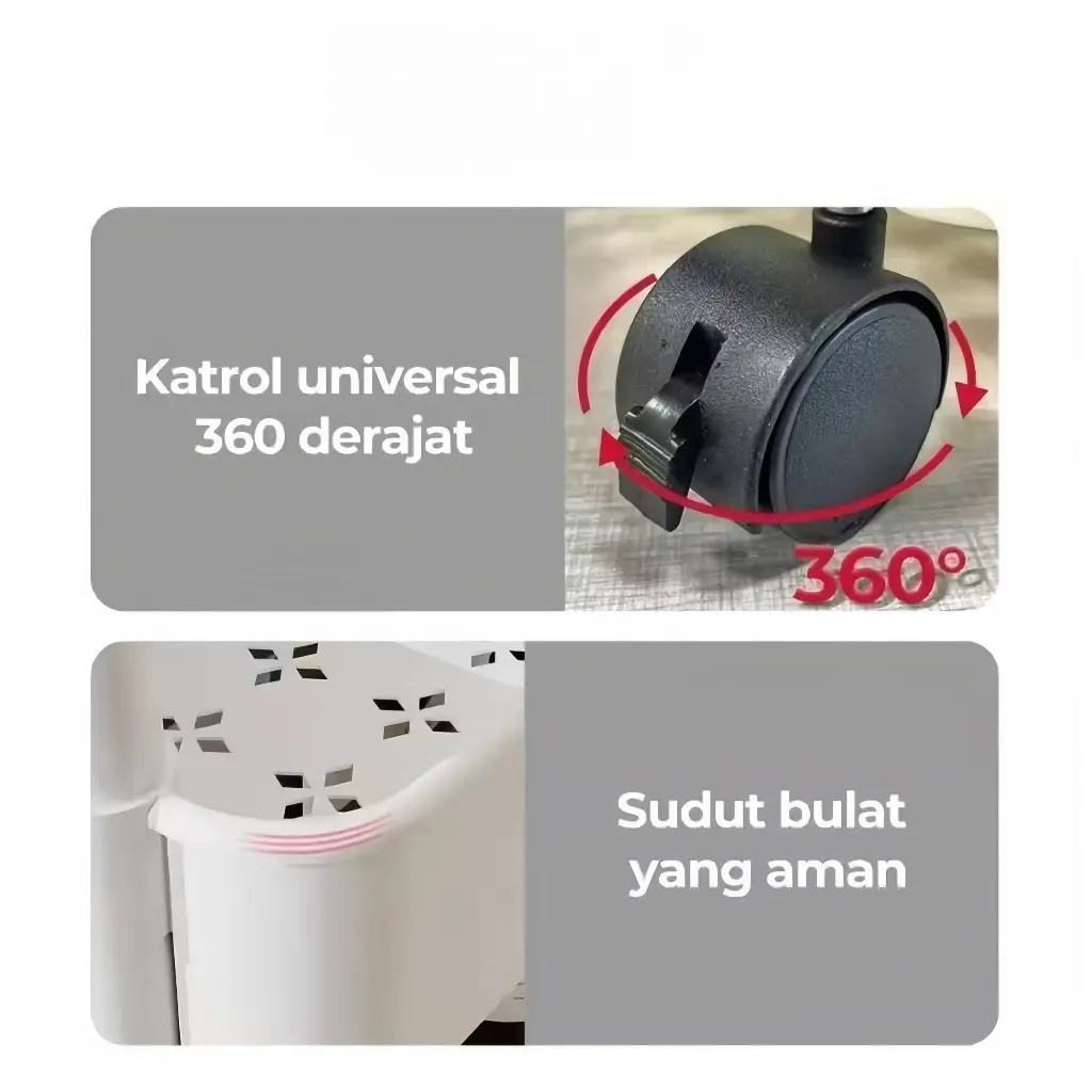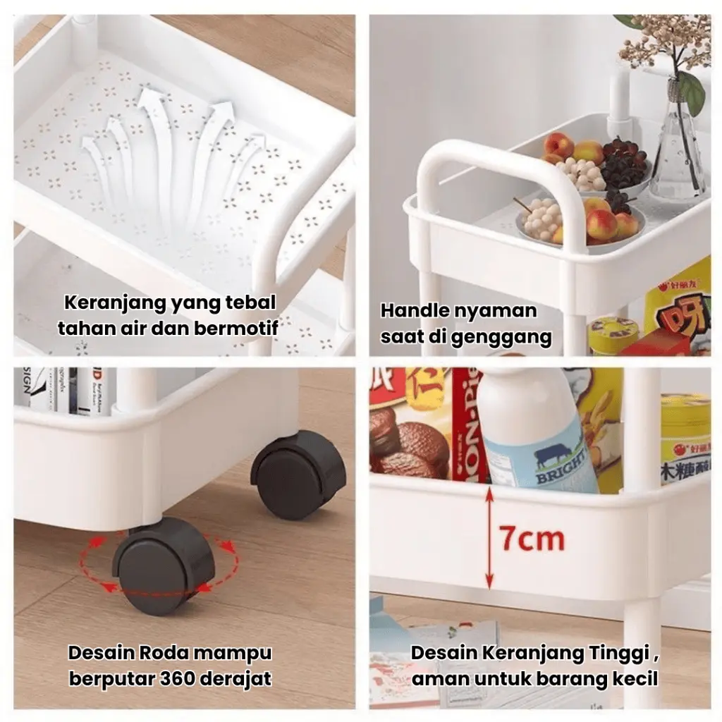Bahan plastik aman tanpa bau, pengerjaan rapi, pegangan kokoh, dorong lancar, kapasitas simpan kuat.