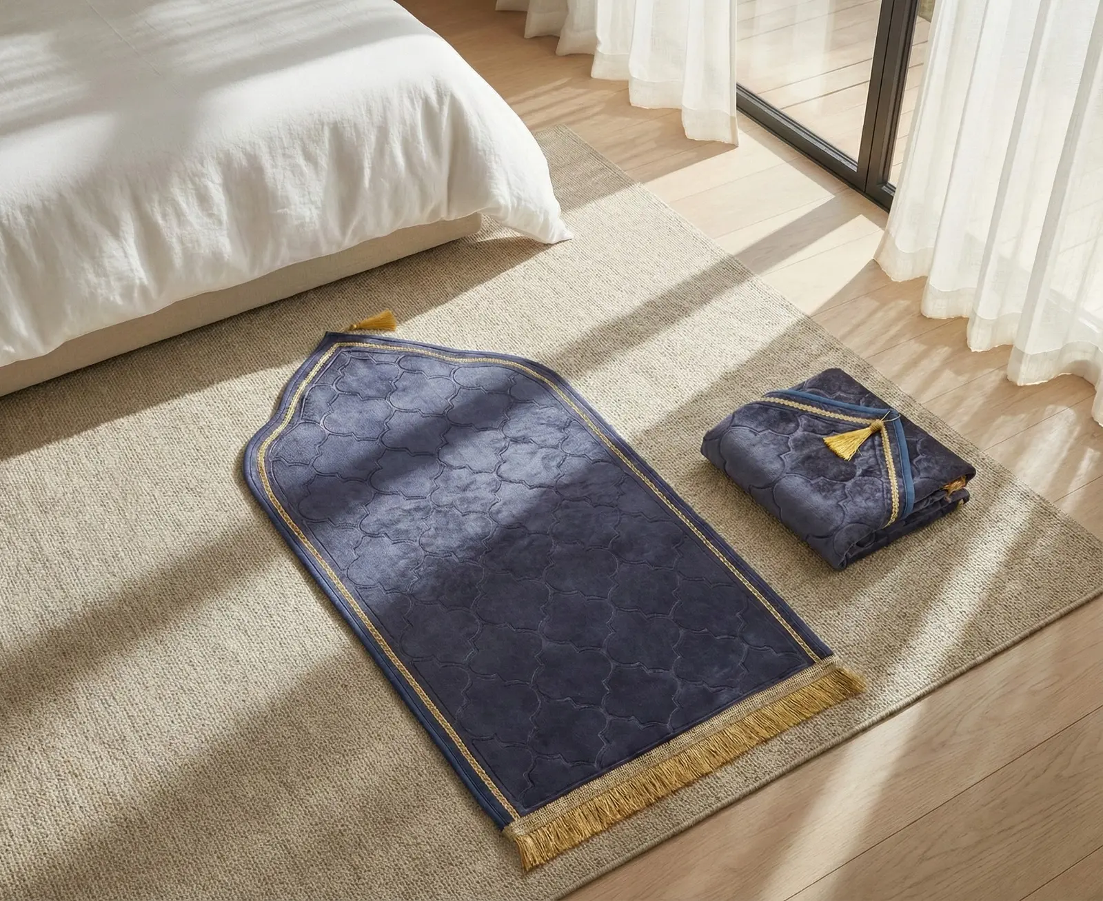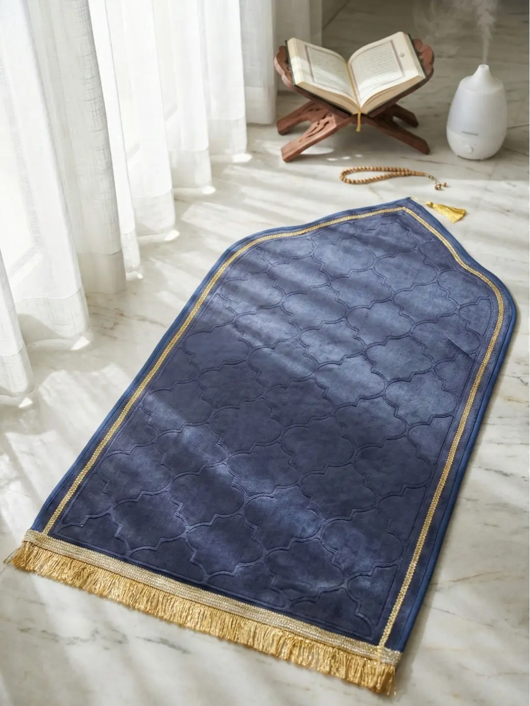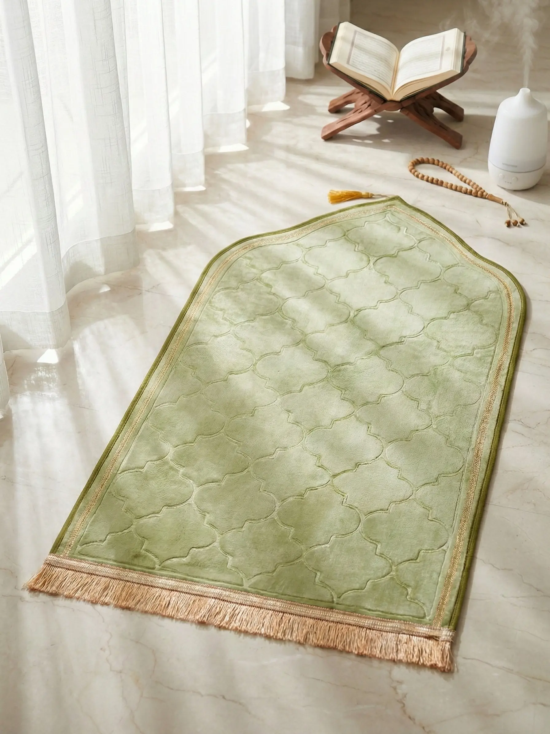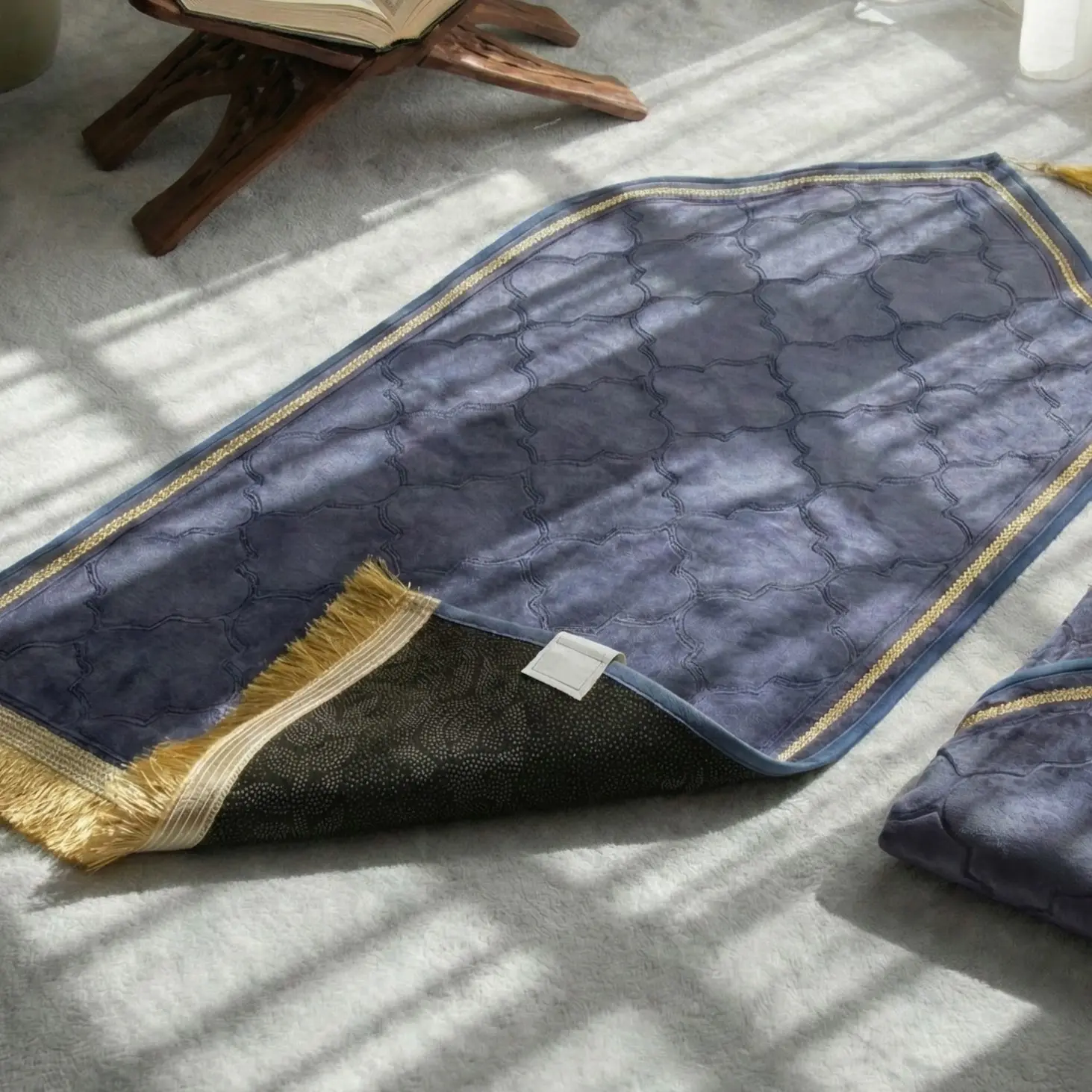 Permukaan sajadah ini lembut dan empuk sehingga pas saat sujud lutut tidak sakit.