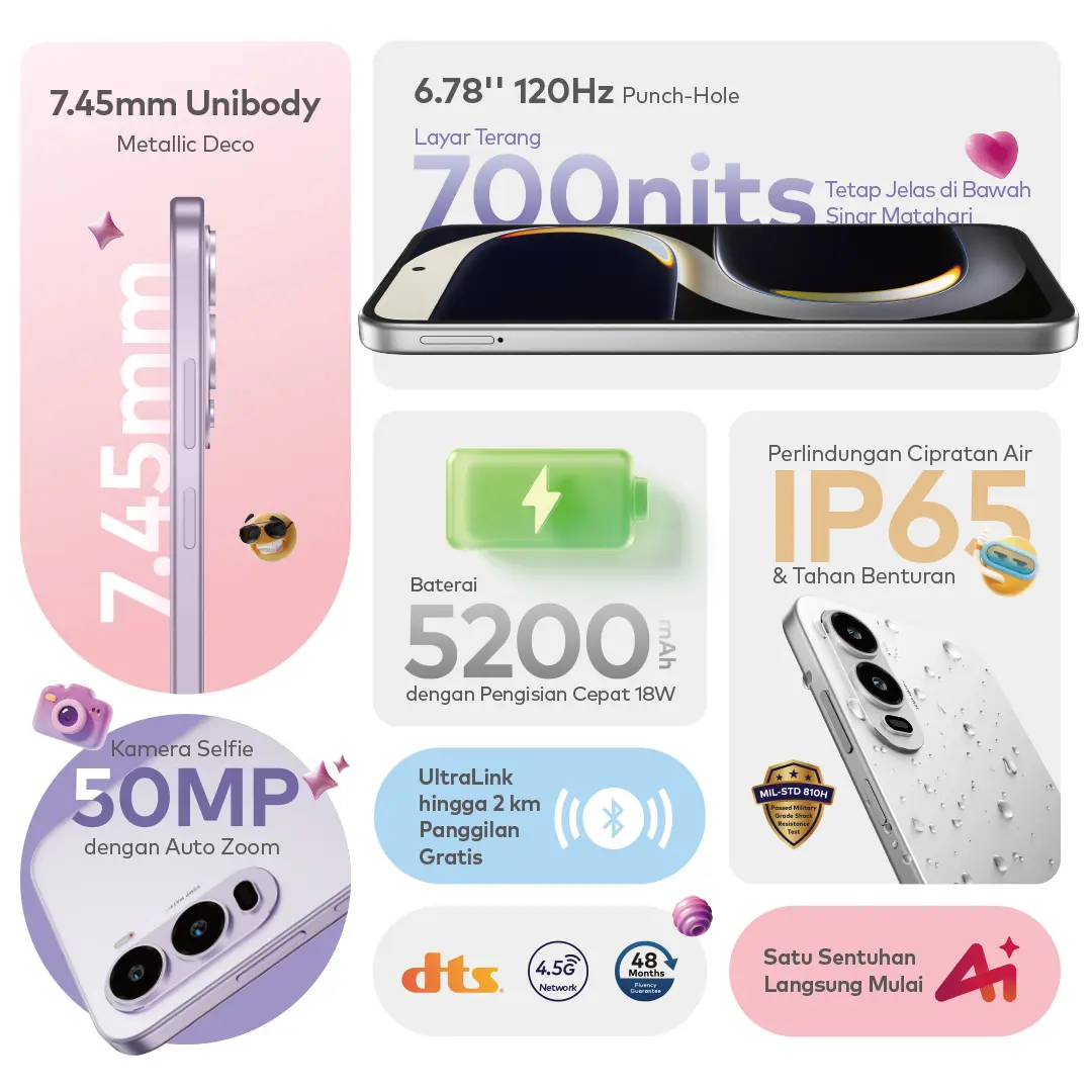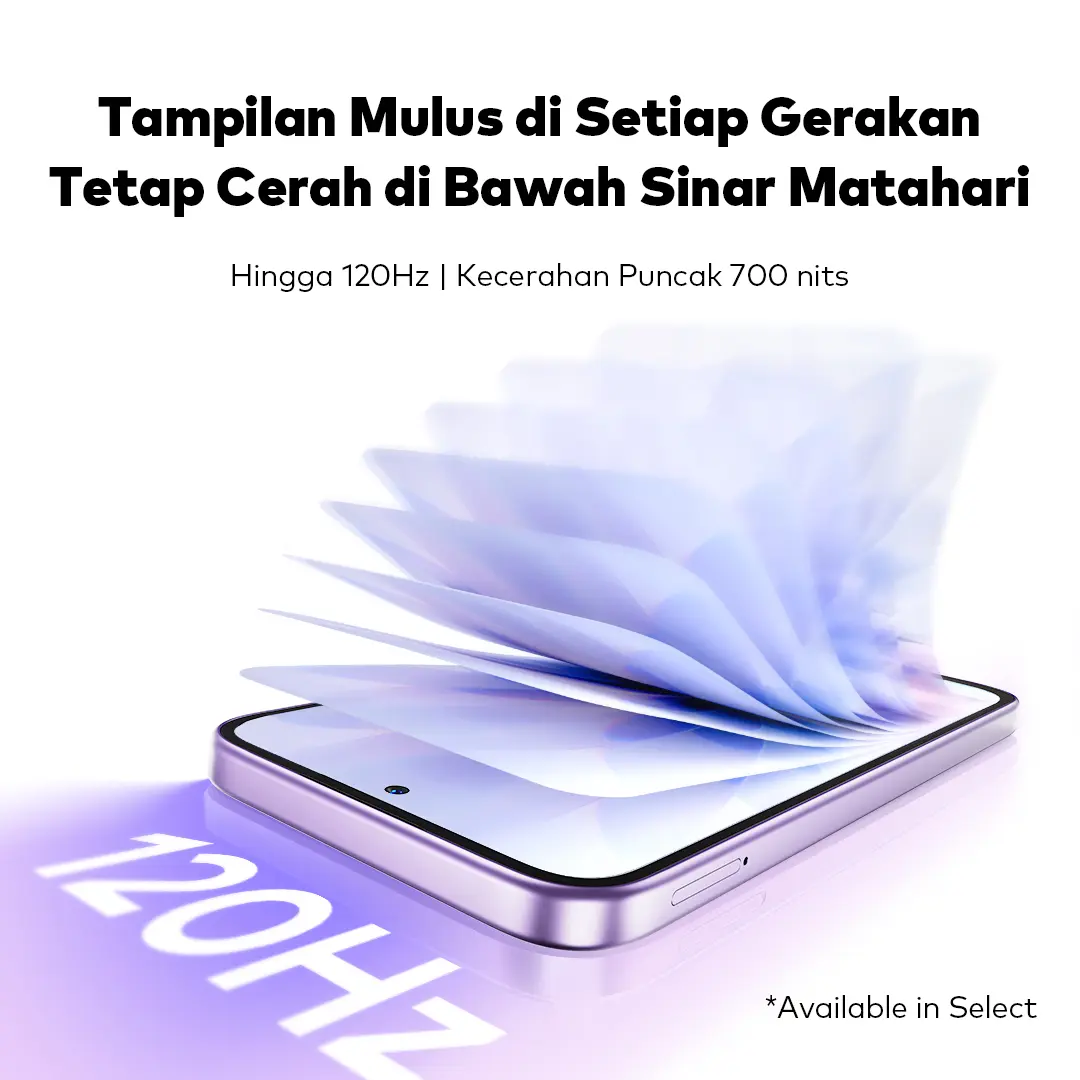 Nikmati pengalaman visual super mulus lewat layar besar 6.78 inci dengan refresh rate 120Hz dan tingkat kecerahan hingga 700 nits, tetap jelas bahkan di bawah sinar matahari. Didukung kamera utama 50MP, hasil foto terlihat tajam dan detail untuk kebutuhan harian maupun konten sosial media.