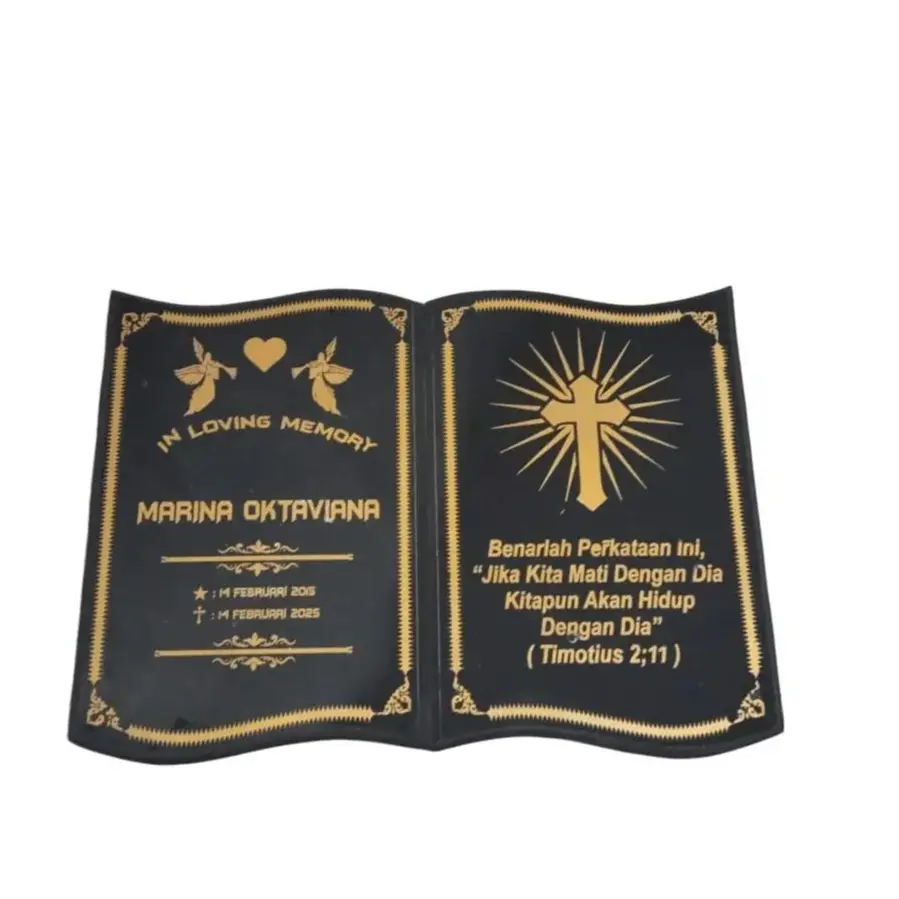 Batu nisan granit lokal dengan desain lempeng Tanpa Dudukan, Dengan tulisan yang dicat warna emas yang jelas dan tahan lama, design samping yang Unik cocok untuk penanda makam yang bermakna dan berkelas.