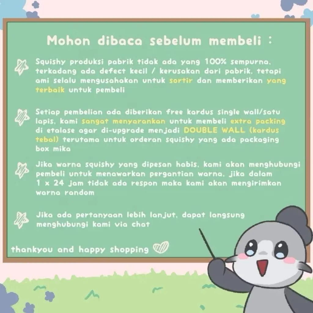 2. β Setiap pembelian ada diberikan free kardus single wall/satu lapis, kami sangat menyarankan untuk membeli extra packing di etalase agar di-upgrade menjadi DOUBLE WALL (kardus tebal) terutama untuk orderan squishy yang ada packaging box mika