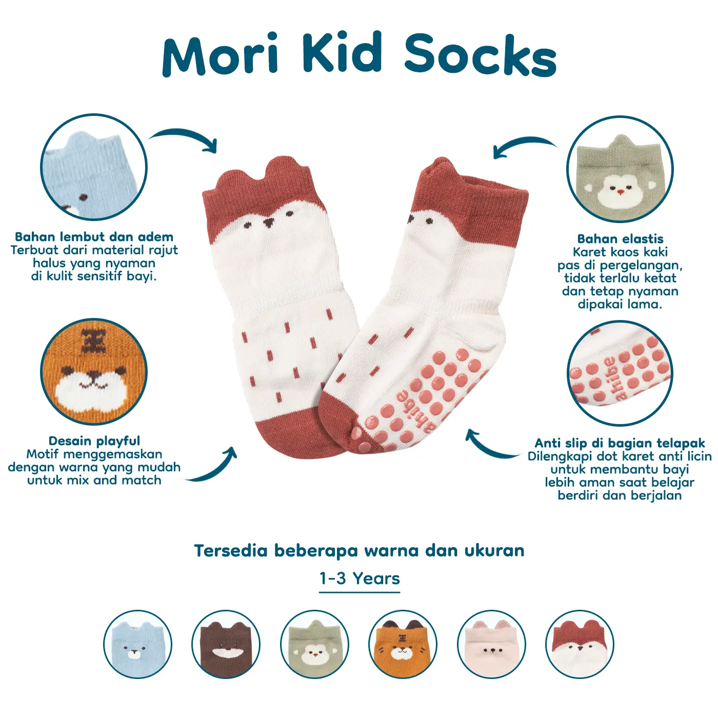 Mori Socks adalah kaos kaki bayi yang di desain lucu membuat penampilan si kecil makin menggemaskan. Dibuat dari bahan lembut dan adem, nyaman dipakai seharian tanpa bikin kaki bayi gerah. Mimi Socks juga tidak mudah melar ataupun tidak meninggalkan bekas di kaki