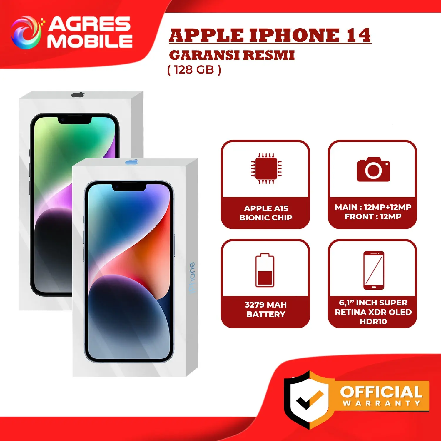 CATATAN UNTUK ORDER : - Mohon untuk tanyakan stok di chat sebelum order - VIDEOKAN saat terima paket agar jika ada kerusakan saat pengiriman bisa kita bantu klaim asuransi. - Konsultasikan kendala dengan admin melalui chat . BUNDLING: - NON BUNDLE : UNIT ONLY BERGARANSI RESMI, DAN BNIB ( BRAND NEW IN BOX ) - PKT ANTIGORES : UNIT + P1 ( SCREEN HANDPHONE ) . APPLE IPHONE 14 128GB BLUE GRS RSMI INDONESIA APPLE IPHONE 14 128GB MIDNIGHT GRS RSMI INDONESIA APPLE IPHONE 14 128GB STARLIGHT GRS RSMI INDONESIA ( GARANSI TAM / GDN / DIGIMAP ) . Spesifikasi : • Deskripsi iPhone 14. Dengan sistem kamera ganda paling hebat di iPhone. Ambil foto yang memukau dalam pencahayaan rendah maupun terang. Deteksi Tabrakan, sebuah fitur keselamatan baru, memanggil bantuan saat Anda tak bisa. . • Layar Super Retina XDR 6,1 inci • Sistem kamera canggih untuk foto yang lebih baik dalam berbagai kondisi pencahayaan • Mode Sinematik kini dalam Dolby Vision 4K pada kecepatan hingga 30 fps • Mode Aksi untuk video handheld yang stabil • Fitur keselamatan penting, —Deteksi Tabrakan1 memanggil bantuan saat Anda tak bisa • Kekuatan baterai sepanjang hari dan pemutaran video hingga 20 jam • Chip A15 Bionic dengan GPU 5-core untuk performa secepat kilat. Seluler 5G super cepat • Fitur ketahanan terdepan di industri dengan Ceramic Shield dan tahan air • iOS 16 menawarkan semakin banyak cara untuk personalisasi, komunikasi, dan berbagi . • Isi kotak iPhone dengan iOS 16. Kabel USB-C ke Lightning. Buku Manual dan dokumentasi lain.