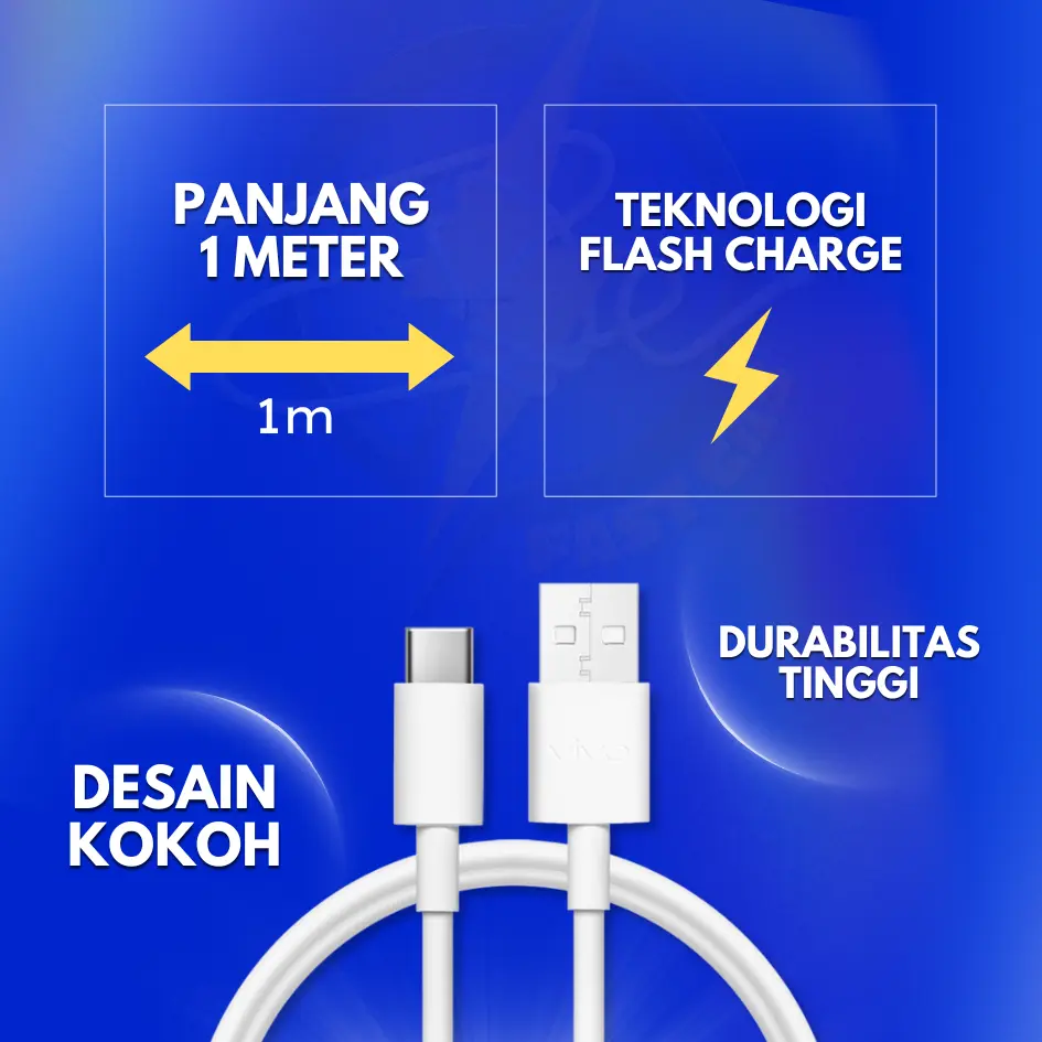Charger V!VO Flash Charge 44 Wat Original Fast Charging Kabel USB Type C untuk Seri: V20 V21 V23 V25 Y27 Y28 Y35 Y36 PRO X70, dan lain lain.