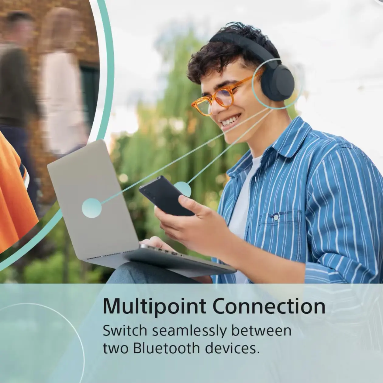 - Multi-Point Connection: Dapat dipasangkan dengan dua perangkat Bluetooth sekaligus, sehingga headphone otomatis terhubung ke perangkat yang memanggil saat ada panggilan masuk.