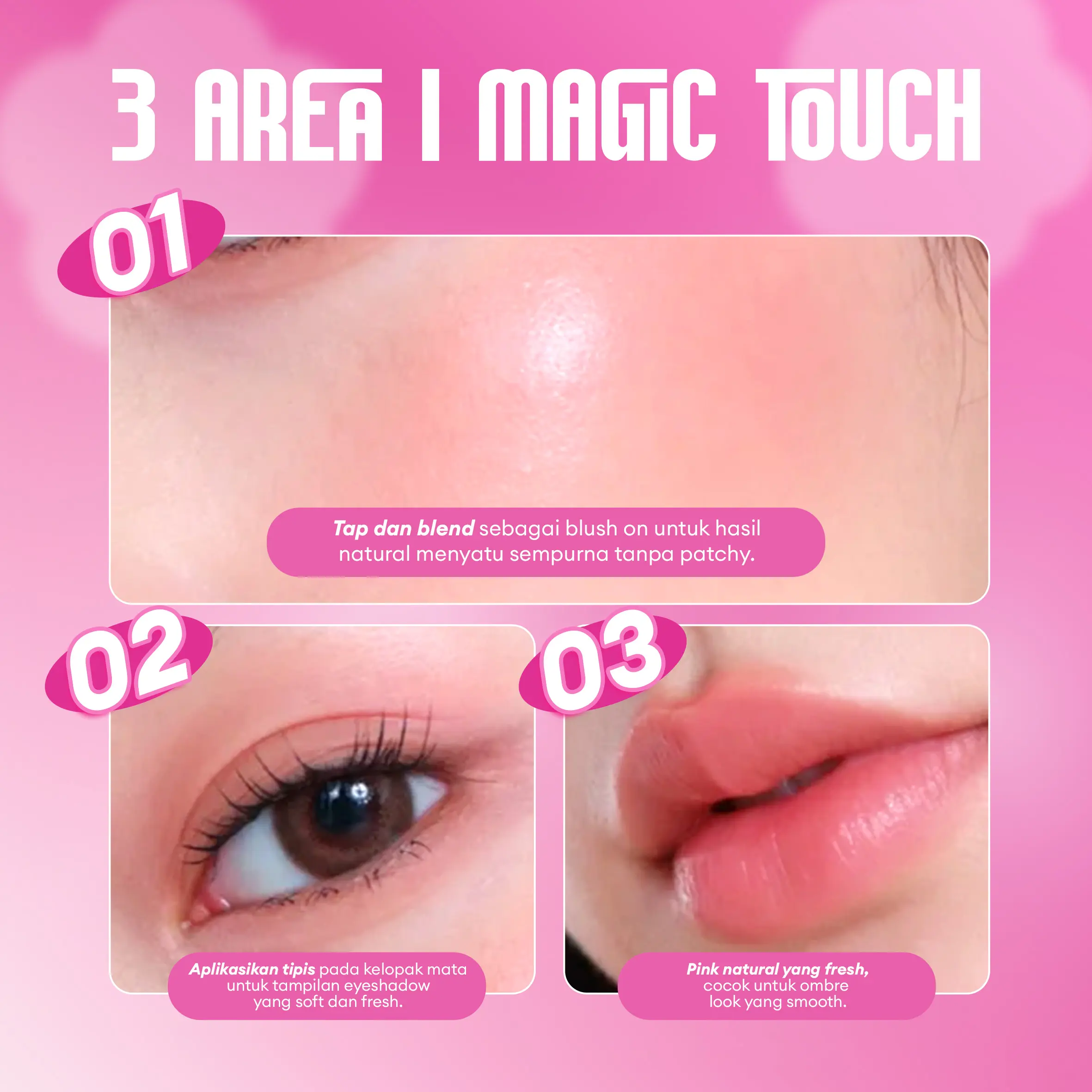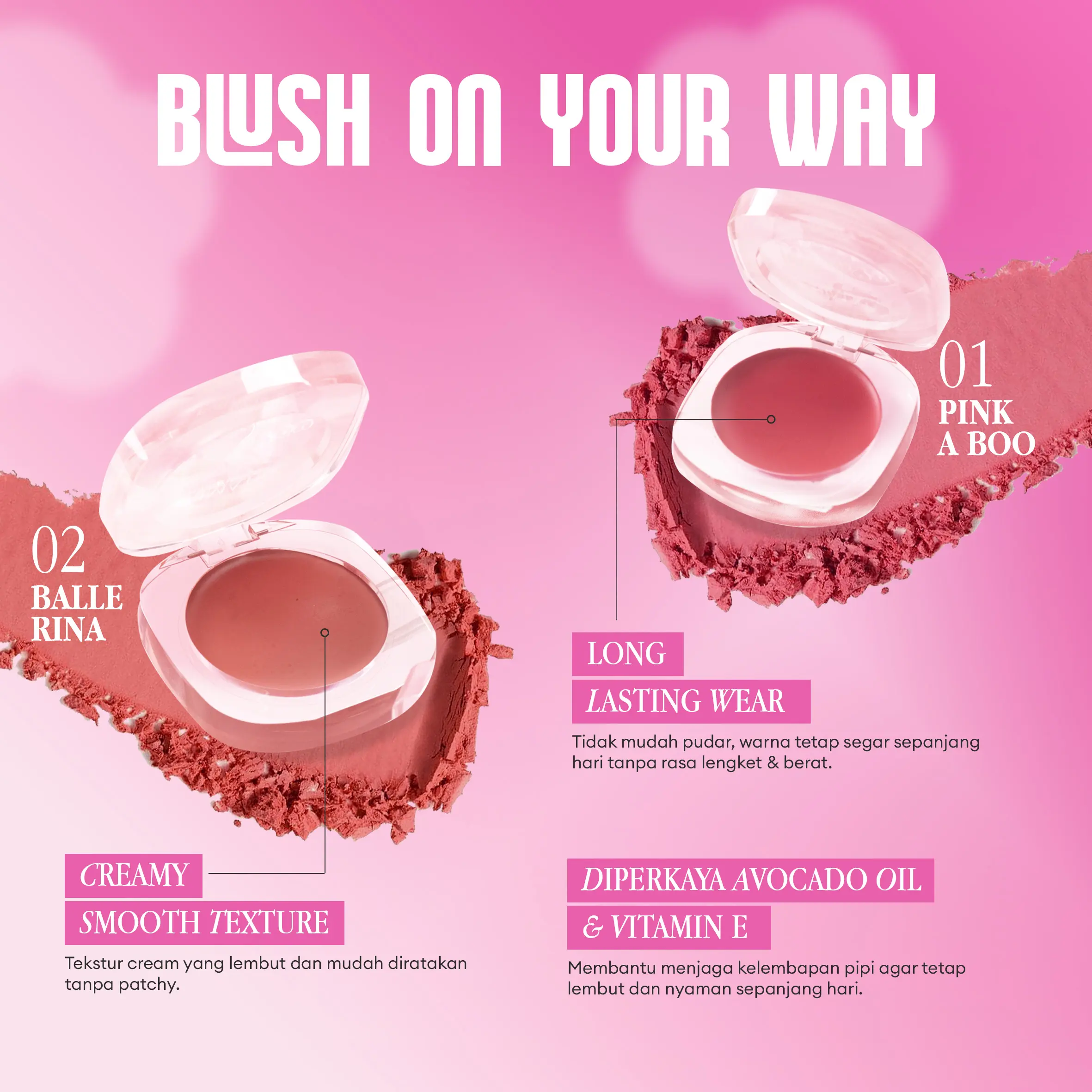 Blush dengan tekstur ringan dan mudah dibaurkan untuk hasil fresh natural tanpa patchy. Tidak terasa berat atau lengket, nyaman dipakai seharian. Bisa digunakan sebagai blush, eyeshadow, dan lip tint untuk tampilan 3-in-1 yang praktis dan on point.