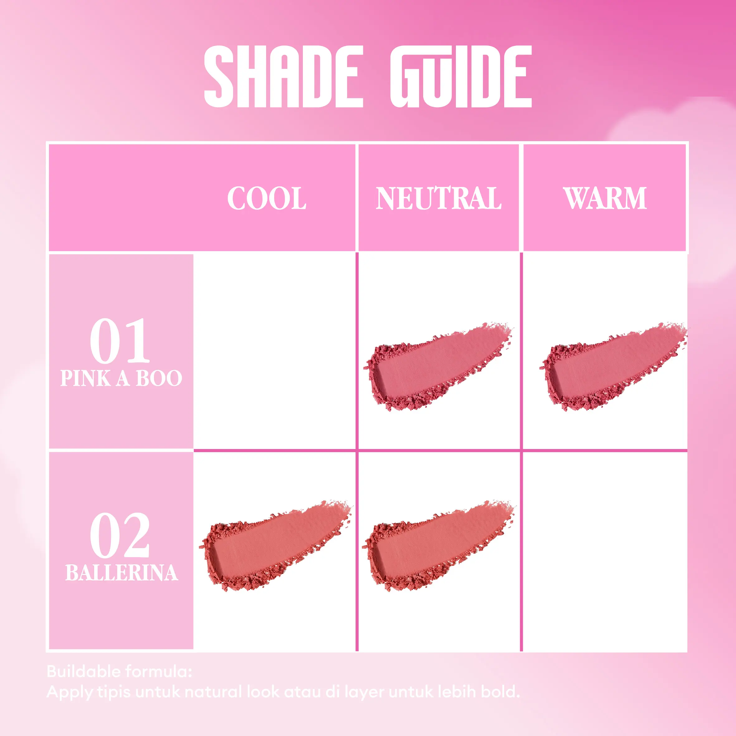 - Pink A Boo: Memberikan kesan hangat, cerah, dan glowing. Cocok untuk semua warna kulit.