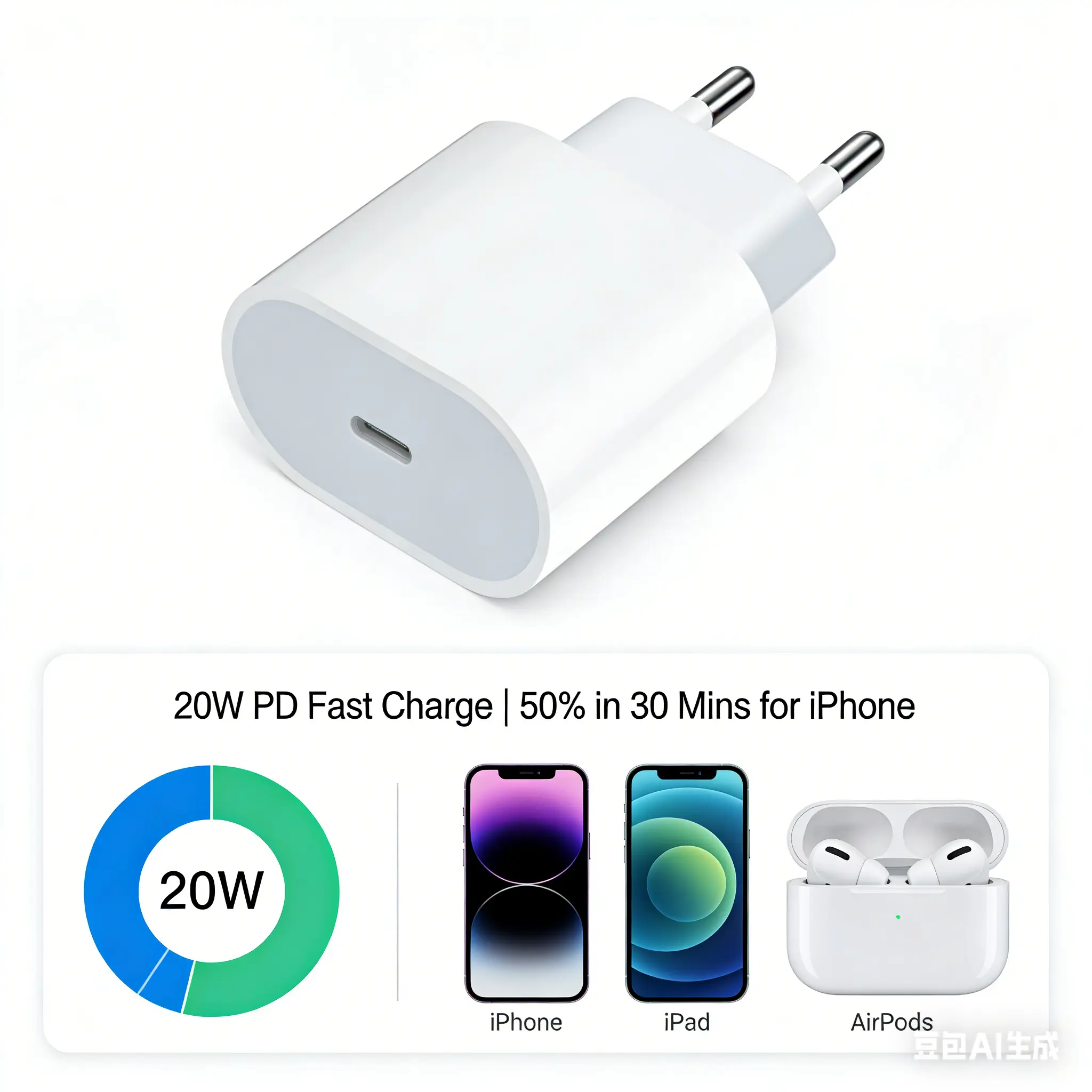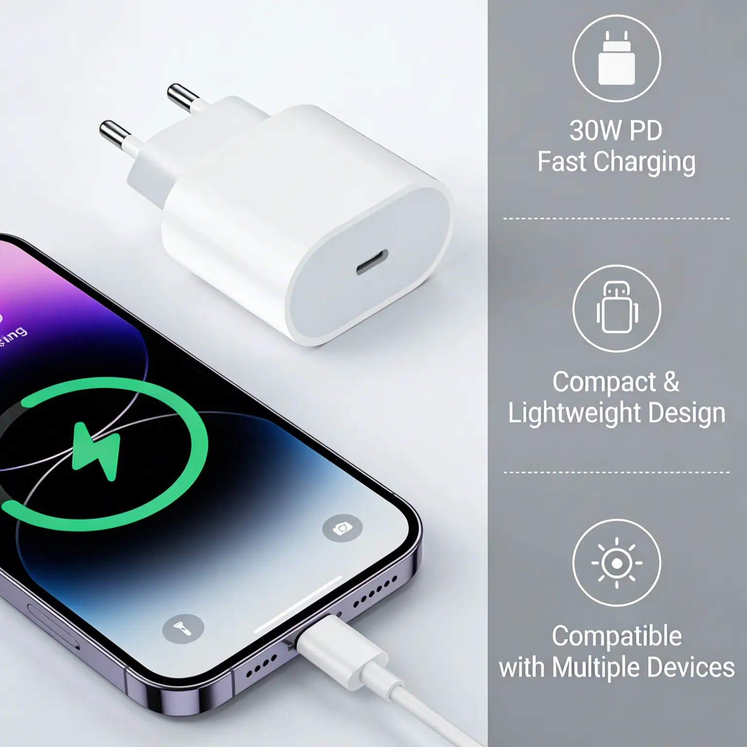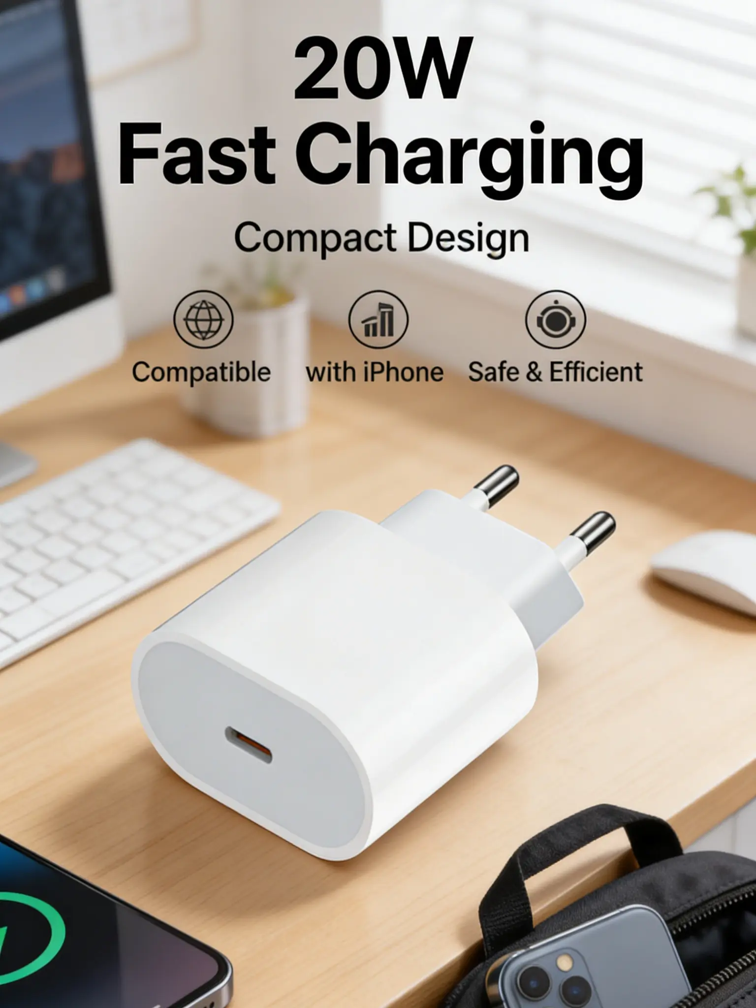 Powered by advanced Power Delivery (PD) 3.0 technology, this 20W fast charger provides lightning-quick charging for your Apple devices. It can charge an iPhone up to 50% battery in just 30 minutes, far faster than standard 5W chargers. Whether you’re in a hurry to head out, need a quick top-up at the office, or want to minimize charging time at home, this adapter ensures your device is ready when you are.