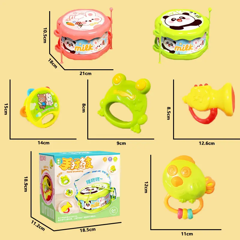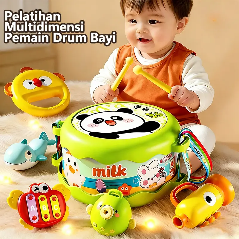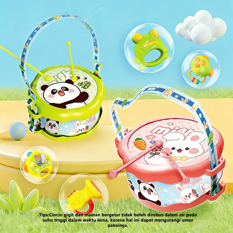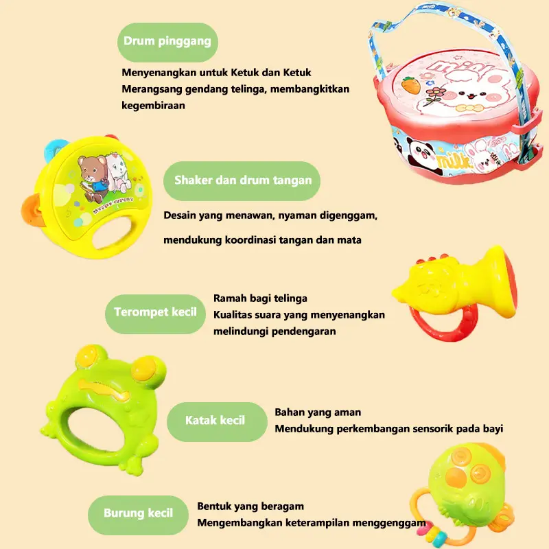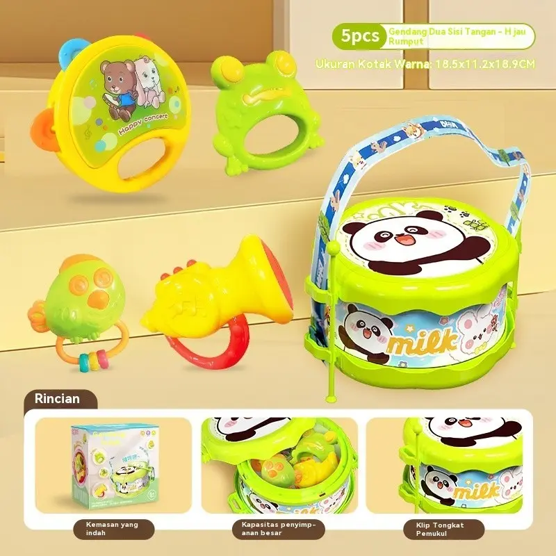 Bahan Plastik Aman dan Ramah Lingkungan Kategori Produk Tangan Drum / Set Alat Musik Perkusi Usia Penggunaan 0-6 tahun (disarankan bermain mandiri pada usia 4-6 tahun) Daftar Isi Paket 1x Drum Dua Sisi + 1x Tamborin Tangan + 1x Kodok Lucu + 1x Terompet Kecil + 1x Peluit Burung