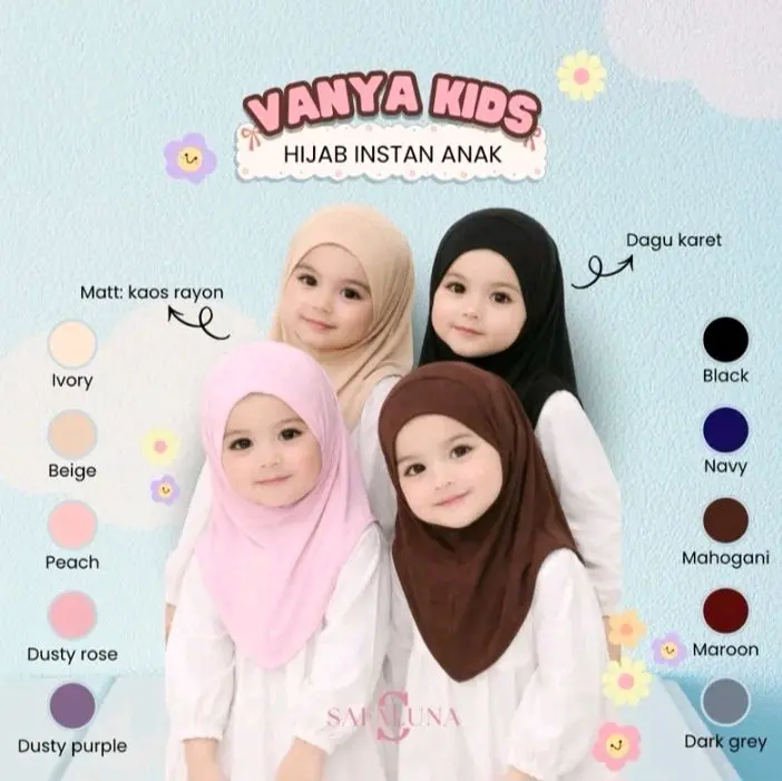 Hijab instan anak Vanya Kids adalah pilihan tepat untuk anak-anak usia 1 - 6 tahun. Terbuat dari bahan rayon viscose yang nyaman dipakai. Cocok untuk anak-anak yang membutuhkan kenyamanan saat menggunakan hijab.