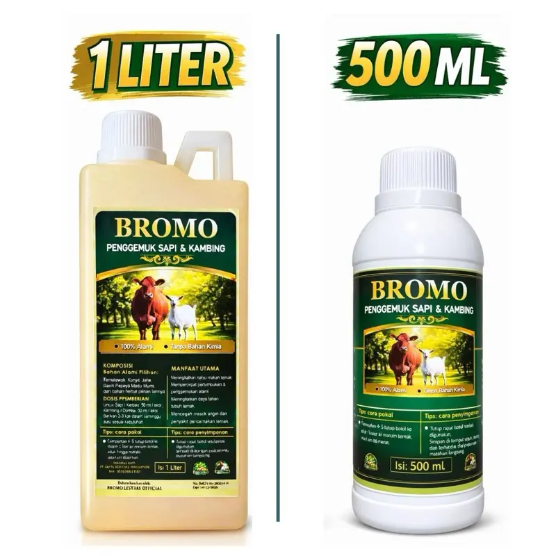 BROMO Penggemuk Ternak adalah suplemen nutrisi yang diformulasikan untuk membantu meningkatkan nafsu makan serta mempercepat pertambahan bobot badan pada ternak seperti sapi, kambing, dan domba.