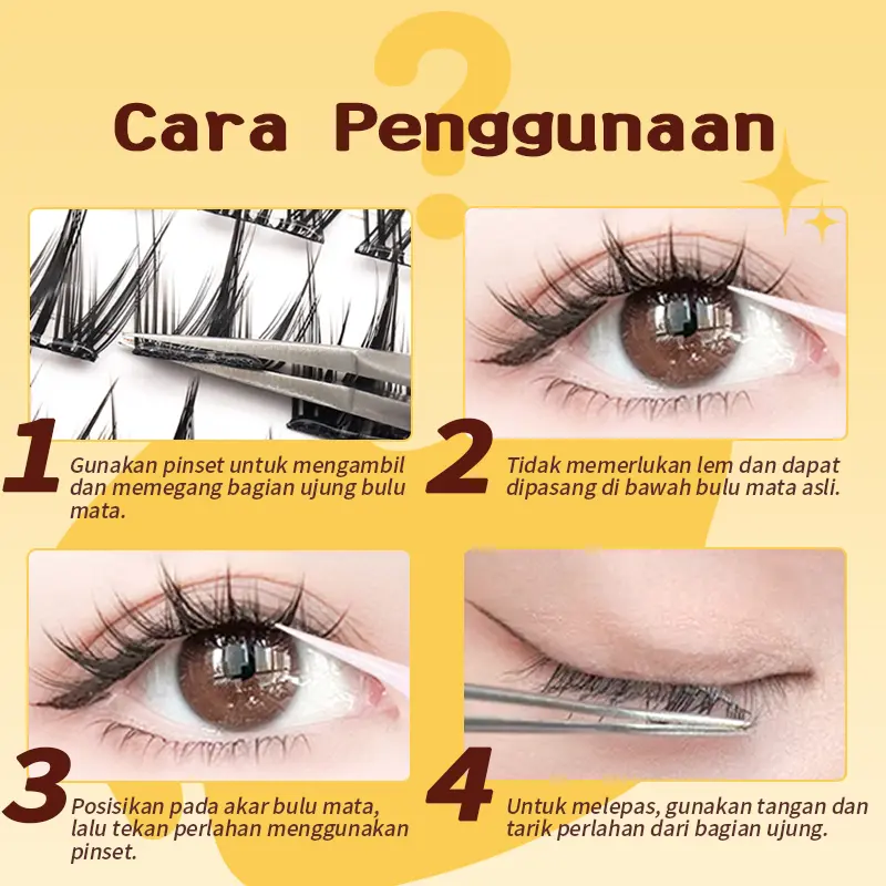 Cara Penggunaan (4 Langkah Mudah): 1. Gunakan tweezers untuk menggenggam ujung bulu mata. 2. Letakkan di bawah bulu mata alami. 3. Tekan lembut di akar untuk menempel. 4. Untuk menghapus: Cukup lepaskan dari ujung (tanpa tangan keras atau sisa).