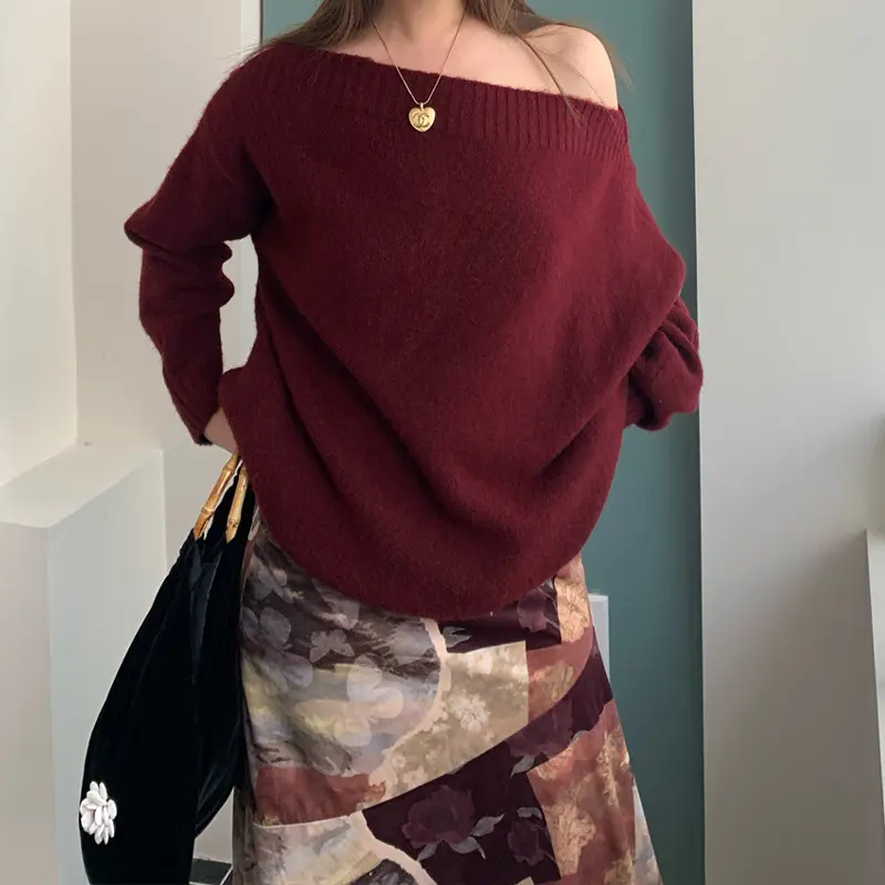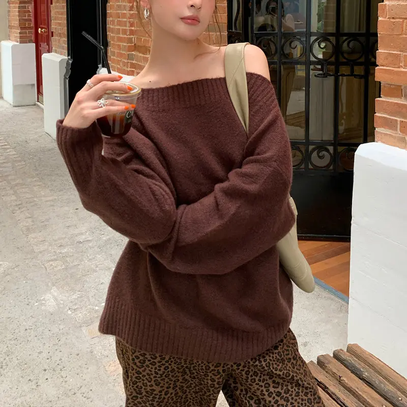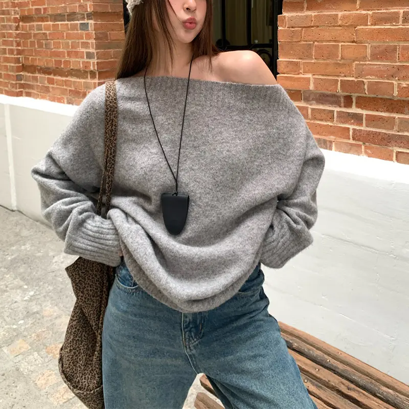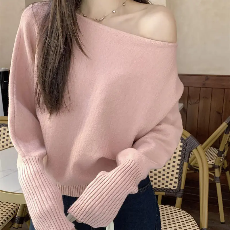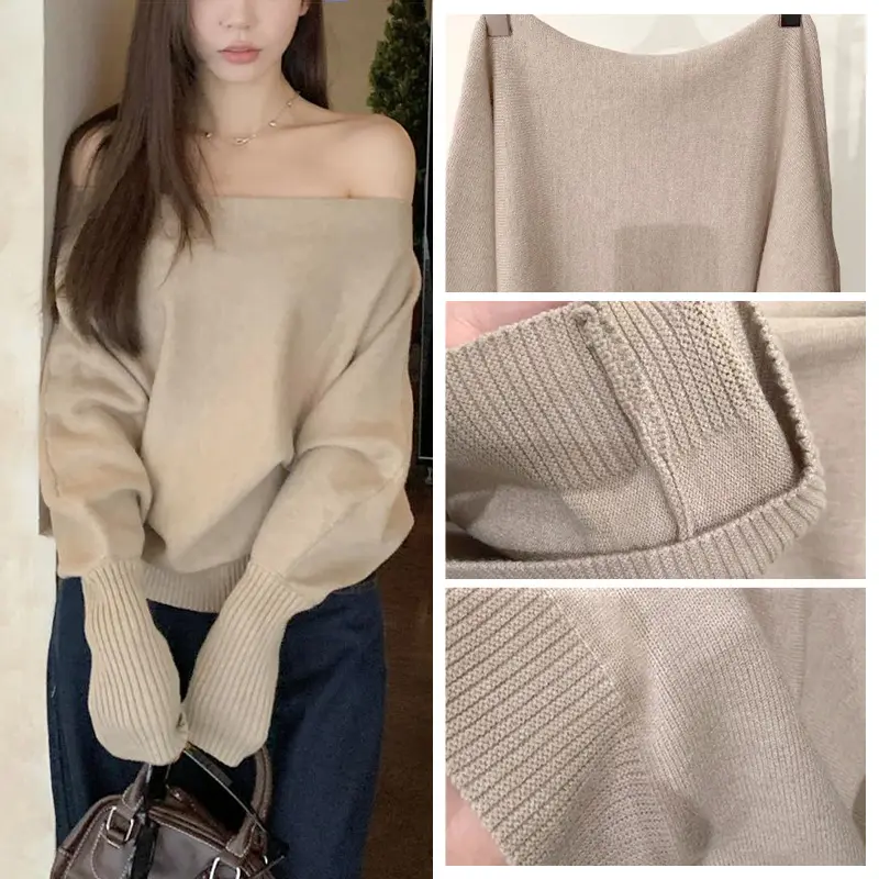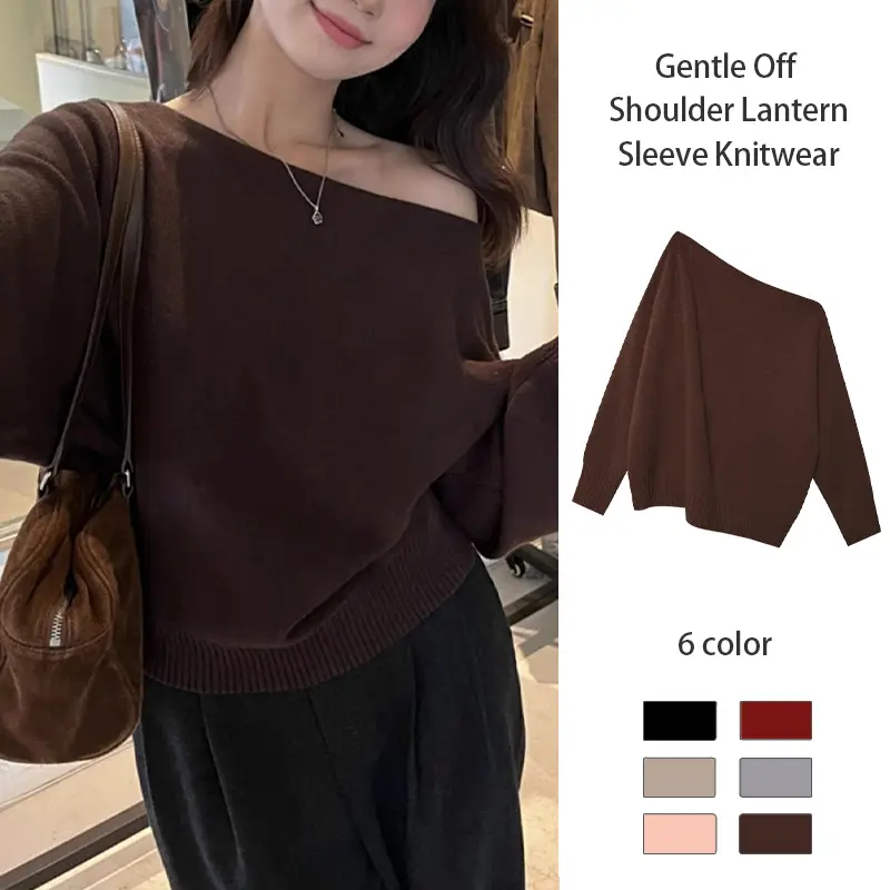 Pakaian Rajut Wanita Lembut dengan Lengan Lentera dan Bahu Terbuka, Sweater dengan Potongan Pinggang yang Rapi