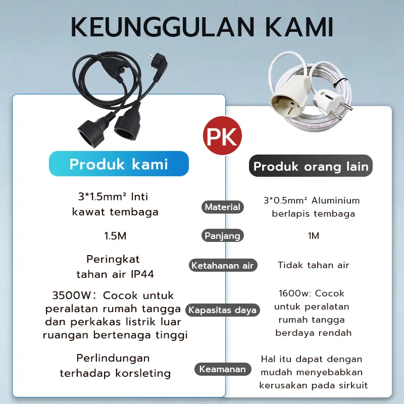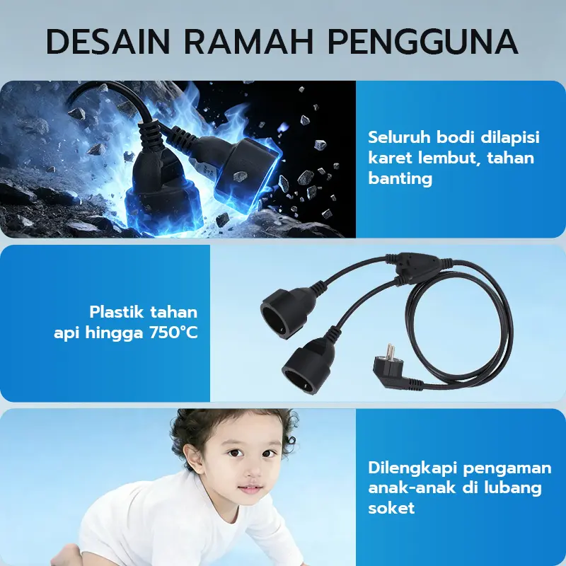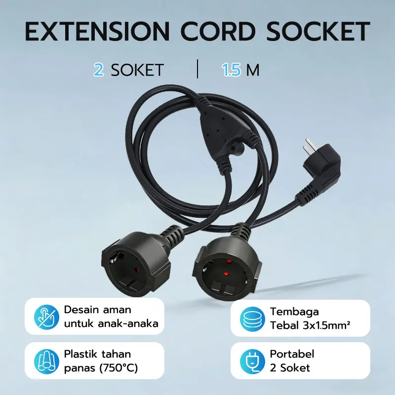 Dengan arus 10 A dan tegangan 220 V, stop kontak ini siap menyalurkan daya ke berbagai perangkat elektronik. Alat ini juga tahan air sehingga cocok dipasang di luar ruangan.