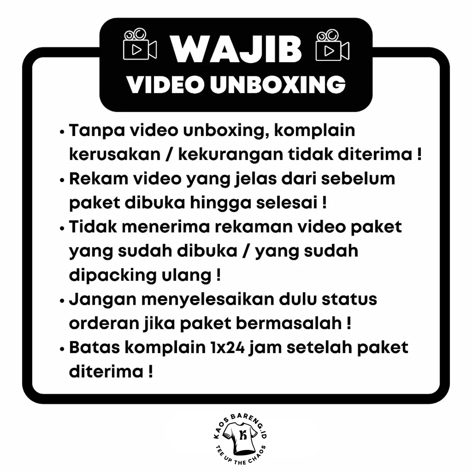 Wajib menyertakan video unboxing untuk claim tukar atau return Jika barang rusak saat pengiriman.