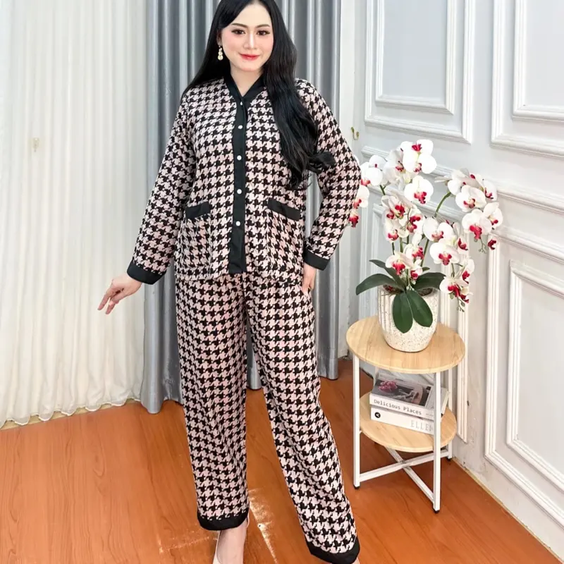 Set piyama ini terbuat dari bahan rayon gred A, dengan lengan panjang dan kancing aktif untuk ibu menyusui. Desain monokrom membuatnya cocok untuk kenyamanan sehari-hari.