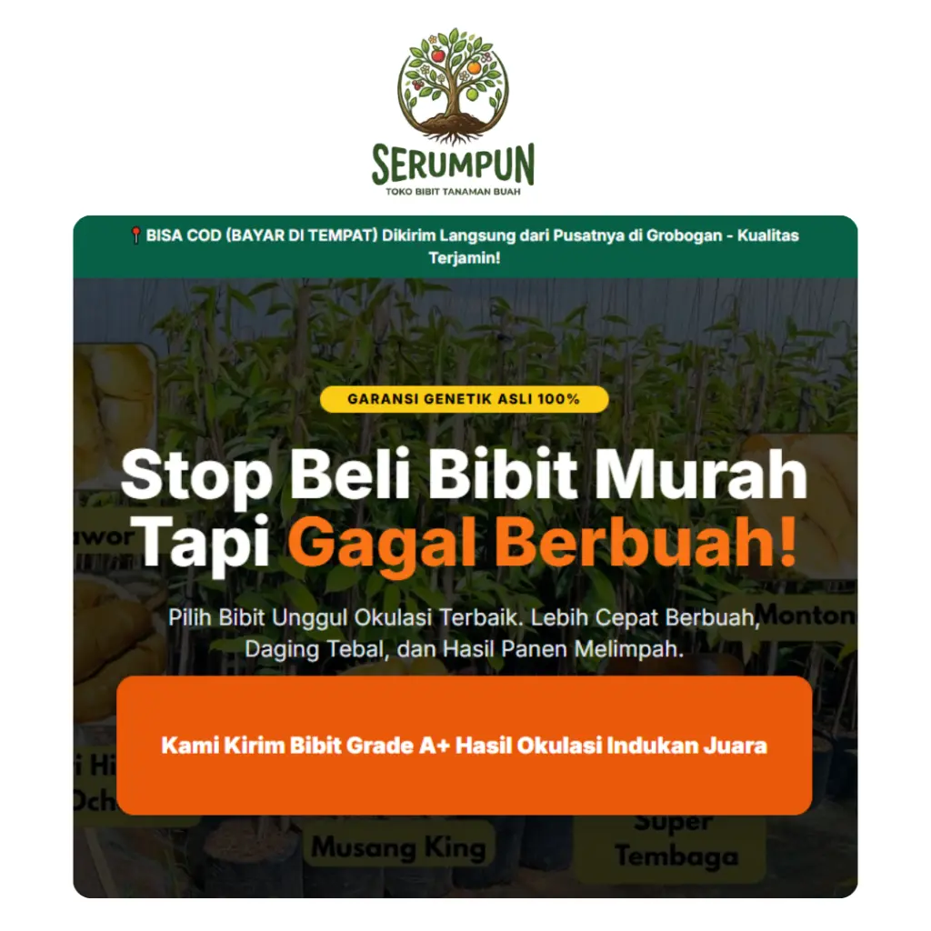 Dapatkan salah satu varietas durian terbaik asli Indonesia! Durian Super Tembaga kini hadir di Toko Serumpun Grobogan. Bibit hasil Okulasi dari indukan pilihan, menjamin pohon yang Genjah (cepat berbuah) dan kualitas buah premium.