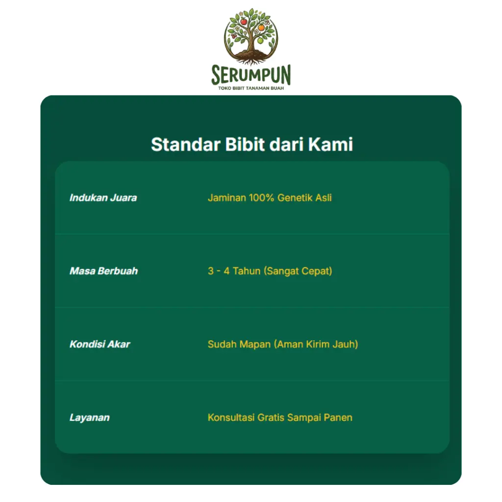 Cepat Berbuah: Melalui proses okulasi/sambung pucuk profesional sehingga masa tunggu panen lebih singkat.