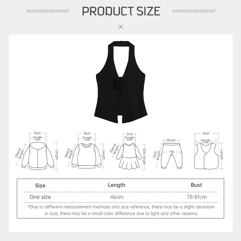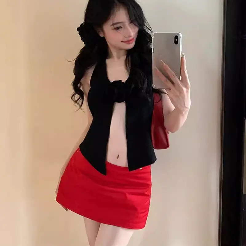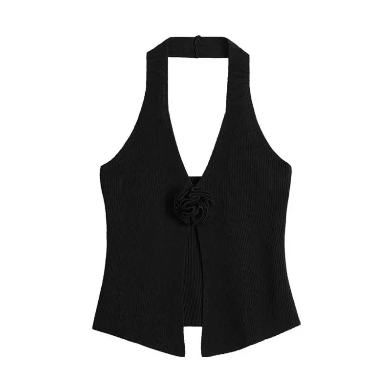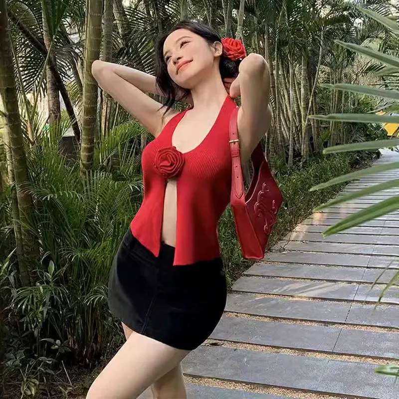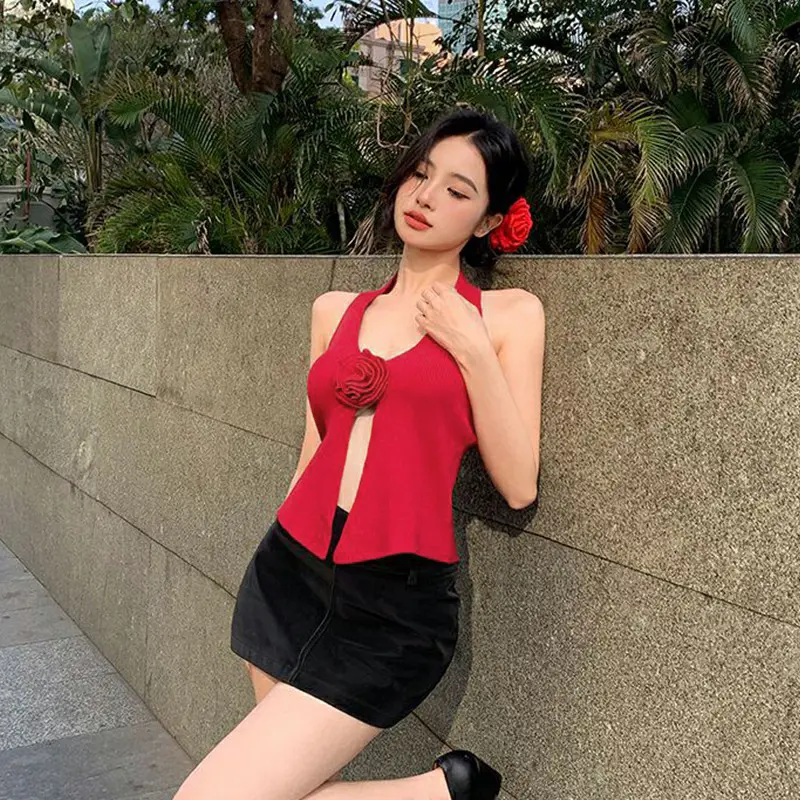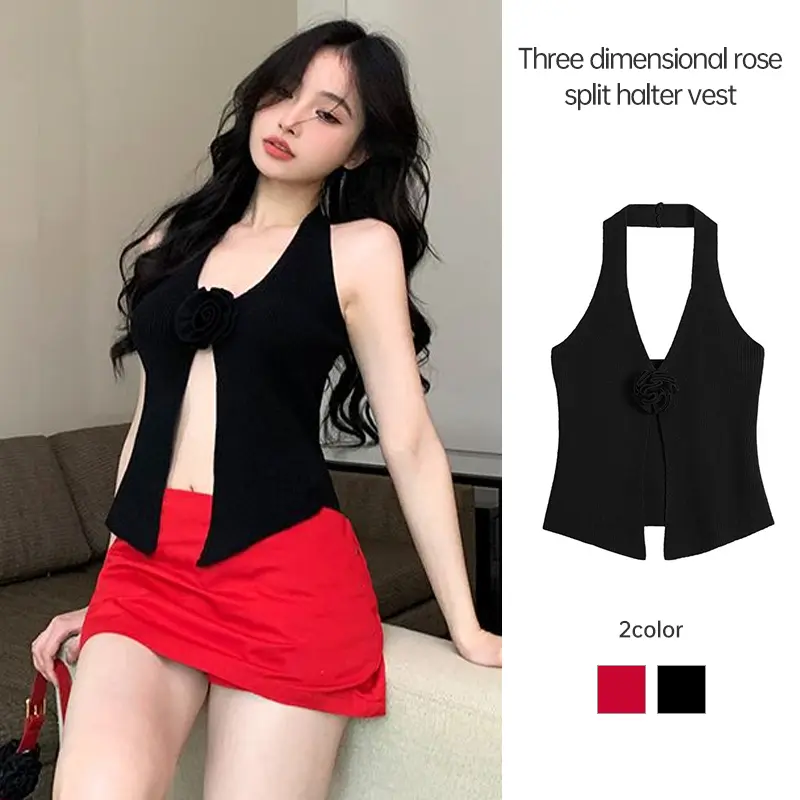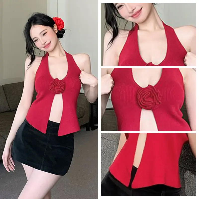 Atasan Suspender Mawar 3D Rompi Leher Gantung Seksi Gadis Pedas Pakaian Rajut Belahan Tidak Beraturan