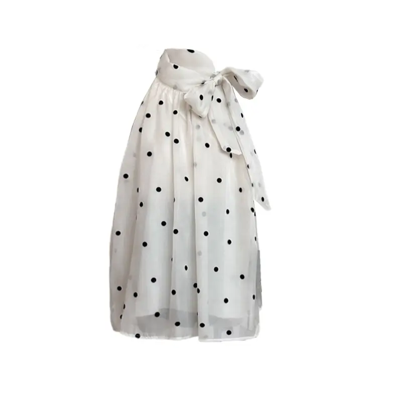 Kemeja renda Polka Dot sederhana tanpa lengan dari bahu atas wanita musim panas menggantung leher