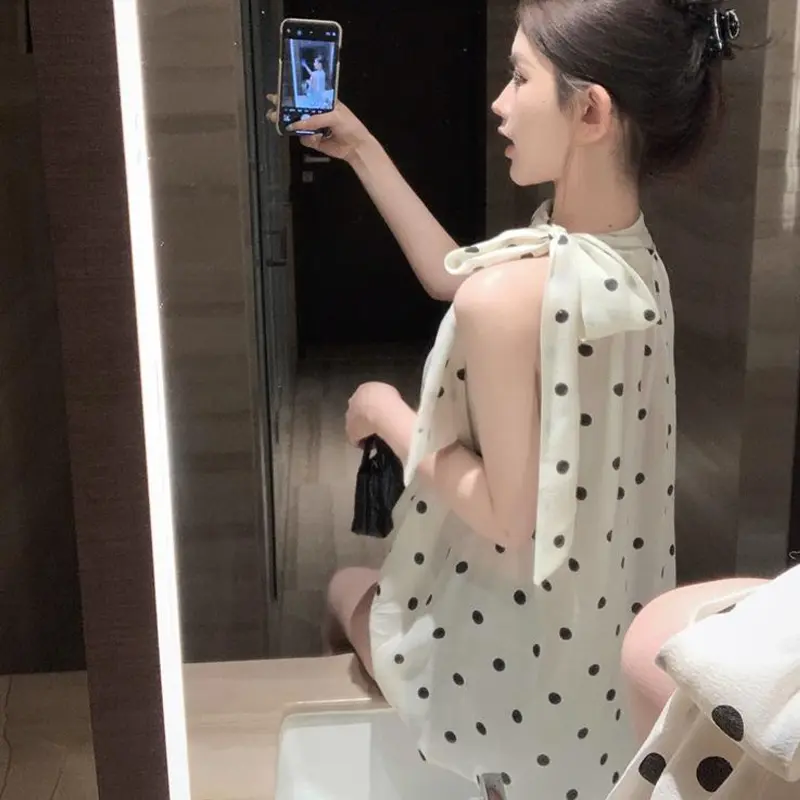 Desain inovatif: Kaos ini memiliki desain leher gantung, dipasangkan dengan cetak titik polka, menambahkan rasa desain. Elegan dan modis, segar dan serbaguna, sangat cocok untuk pakaian perjalanan.