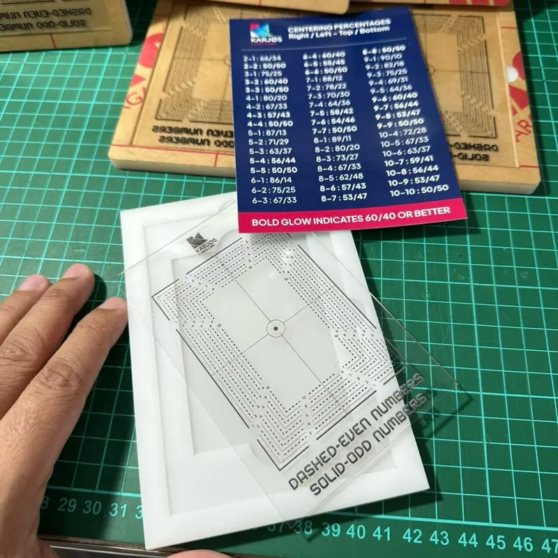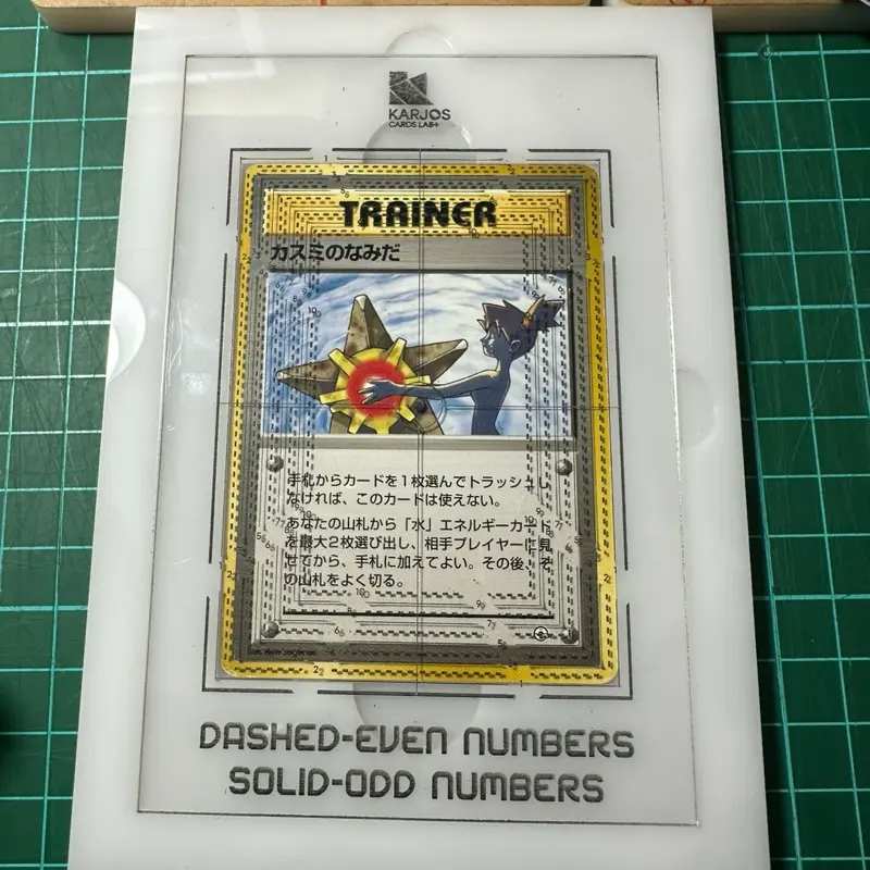 Alat presisi untuk mengukur centering kartu TCG secara akurat sebelum grading atau sebelum dijual ke kolektor.
