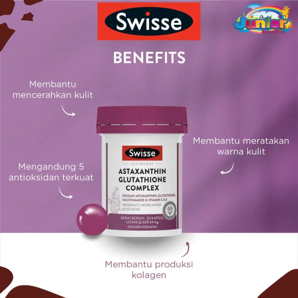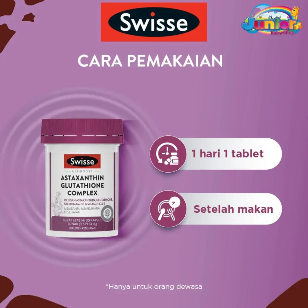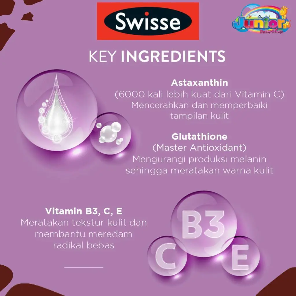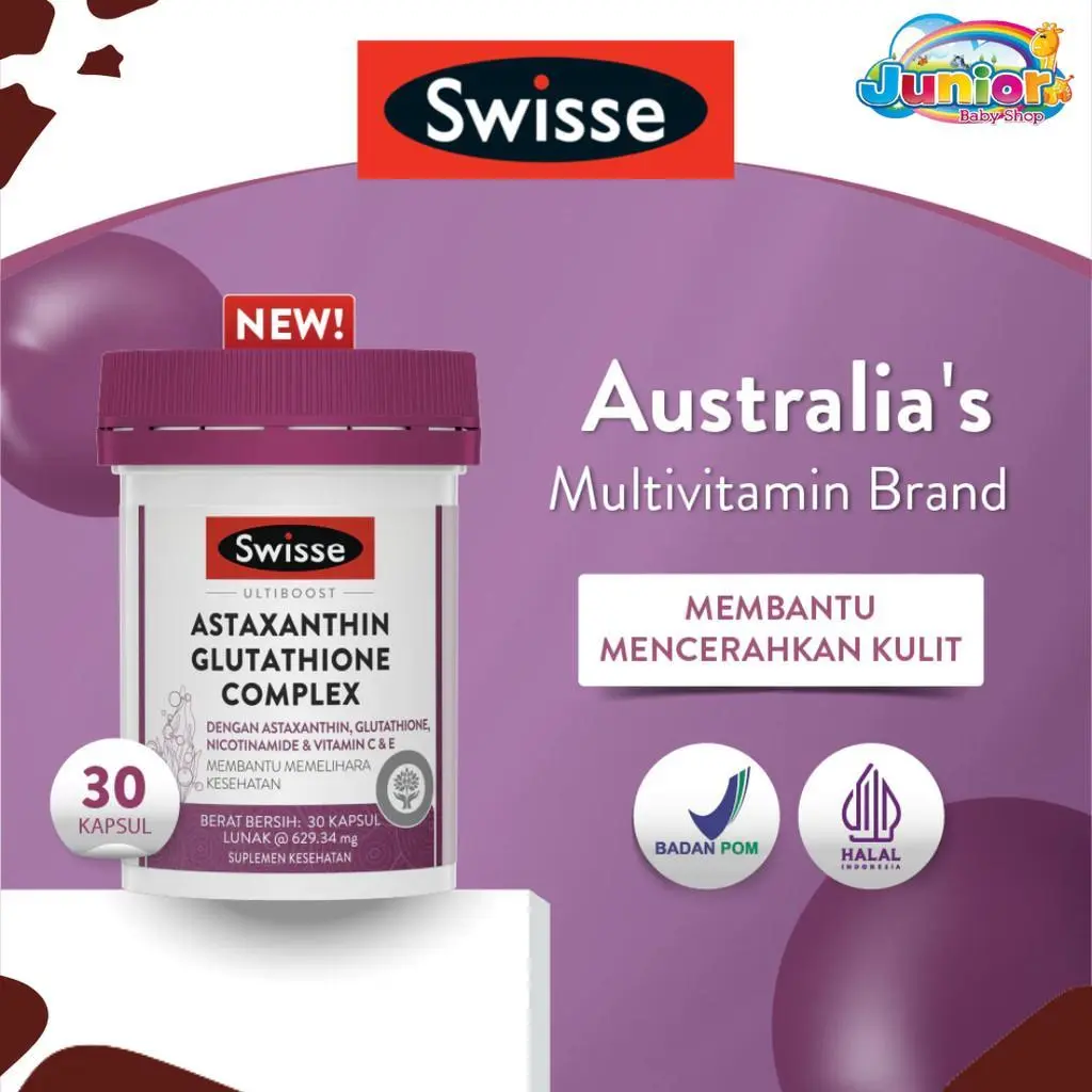 Swisse Astaxanthin Gutathione Complex adalah multivitamin yang mengandung Astaxanthinm Gutathione, Niacinamide, Vitamin C, dan Vitamin E yang dapat membantu menutrisi kulit.