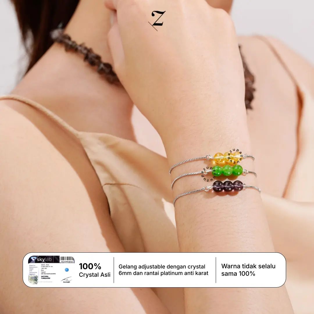 Gelang berbahan titanium dengan pilihan warna silver dan gold yang telah dipadukan dengan crystal asli berukuran 6mm, sehingga bisa kamu afirmasikan setiap saat. Dapat disesuaikan dengan ukuran pergelangan tangan dan mudah diserut.